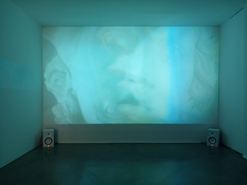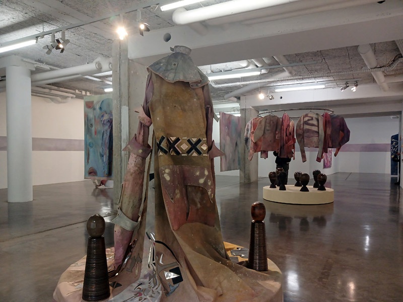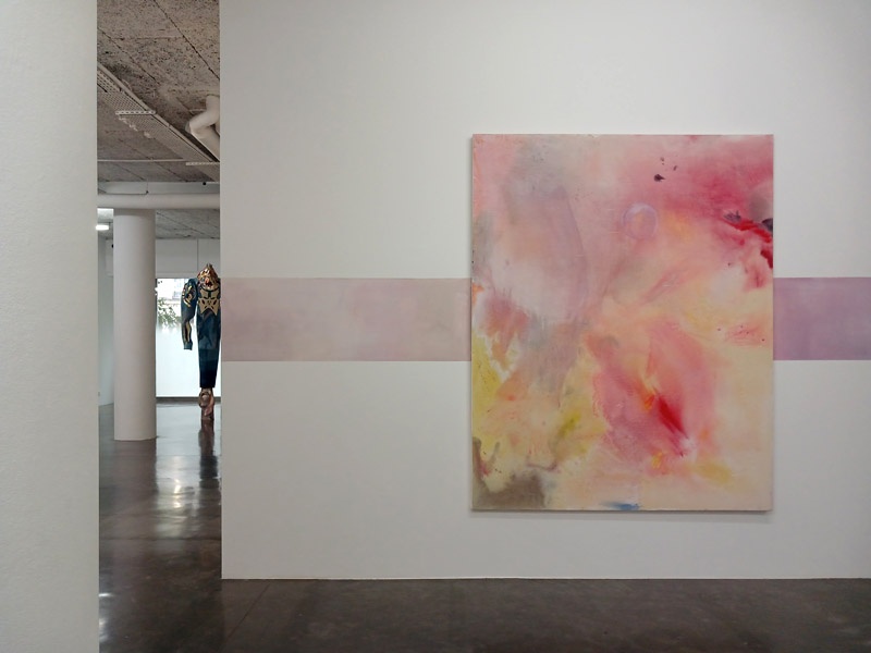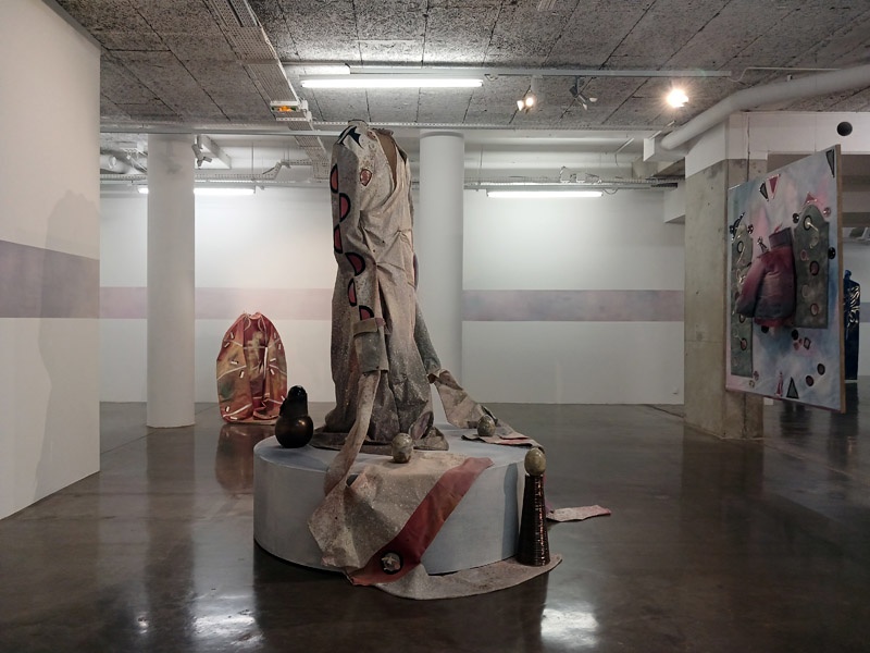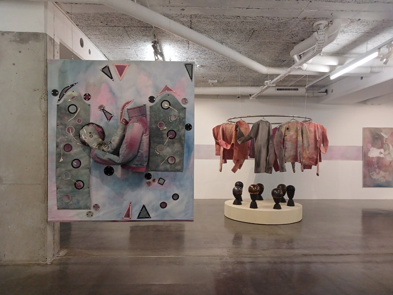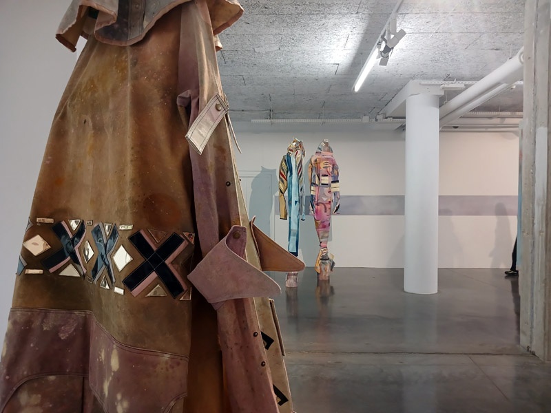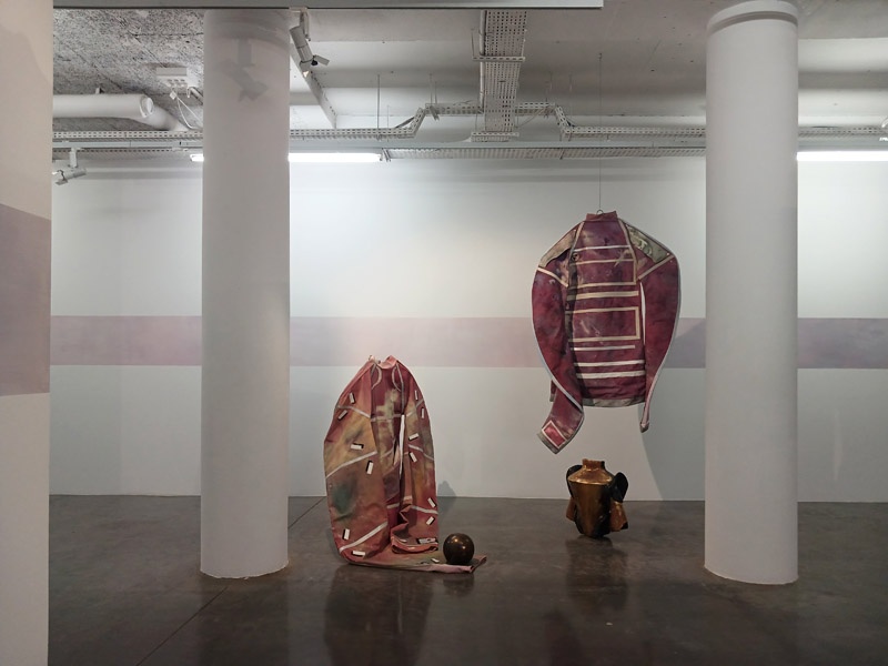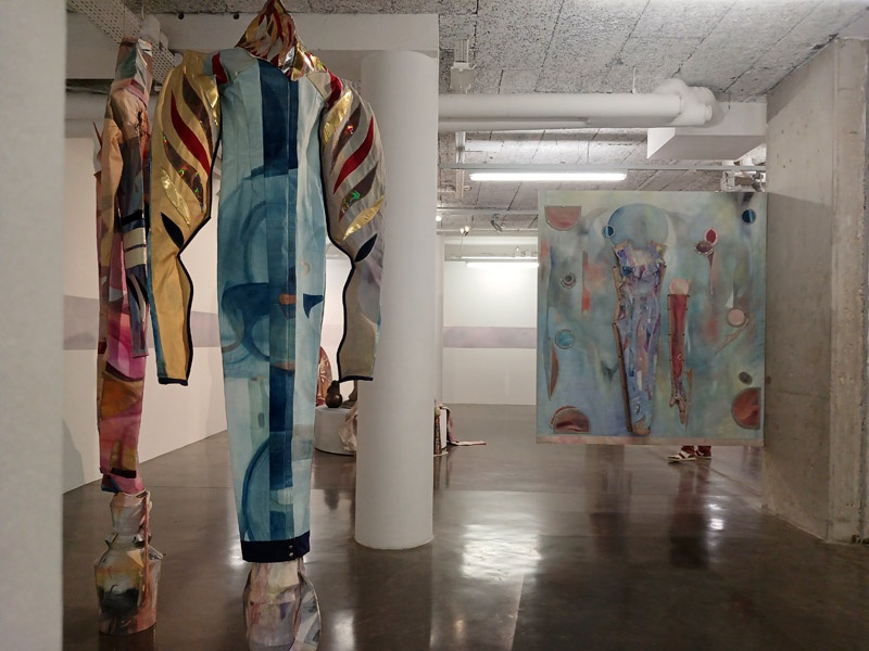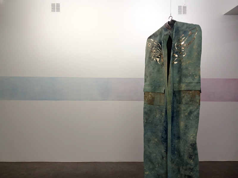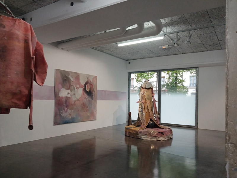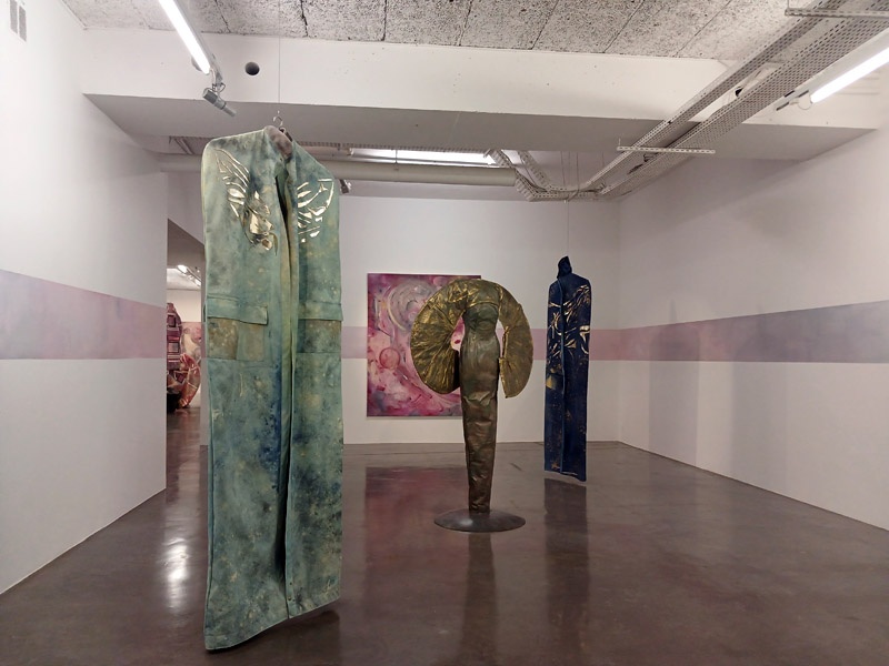 Elle découpe ses anciennes toiles, y greffe des fragments de matériaux trouvés, d’objets abandonnés. Ses techniques de découpe et de montage évoquent celles du champ cinématographique. De cette archéologie personnelle naissent des oeuvres hybrides : costumes sans corps, entre armure et camouflage, silhouettes flottantes, figures en suspension. L’absence des corps suggérés renforce paradoxalement leur présence et des figures insaisissables se fondent dans la couleur qui les entoure à la manière d’un halo, leur confèrant une aura particulière.