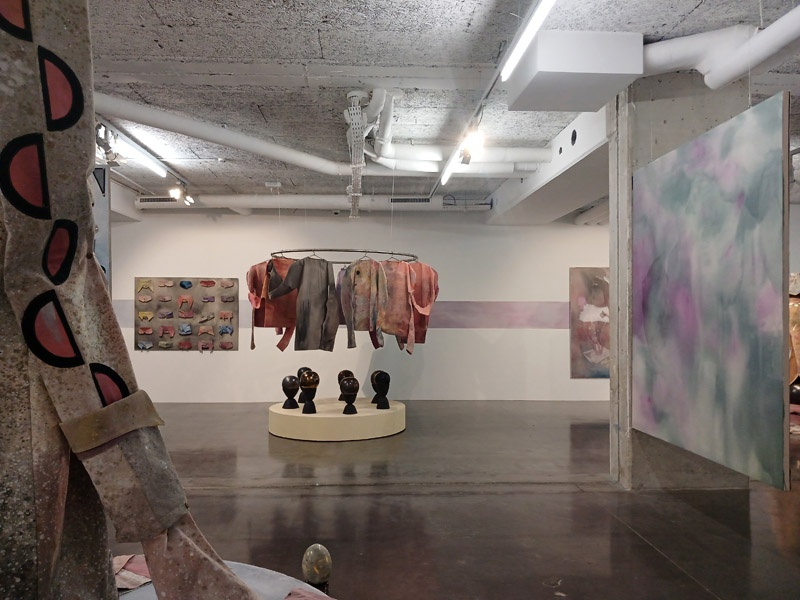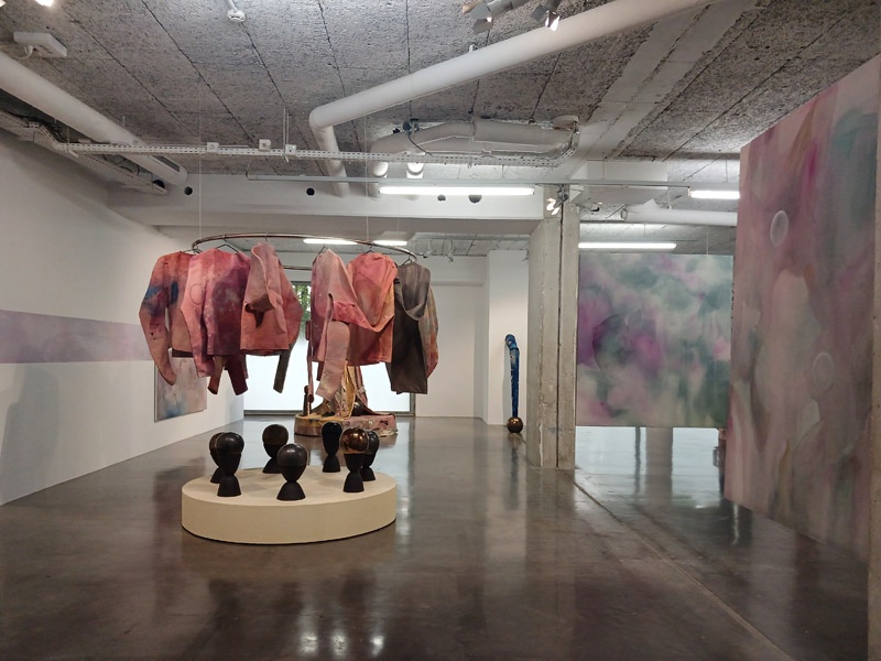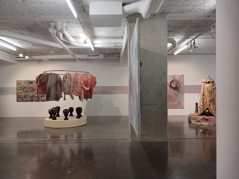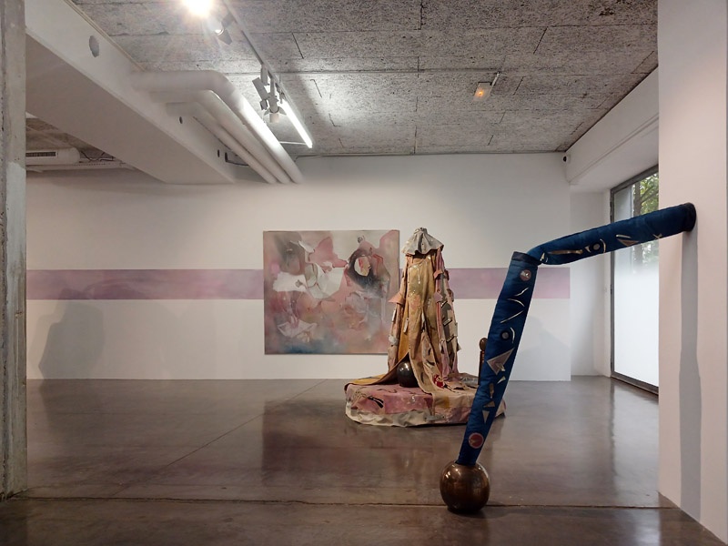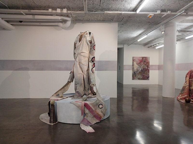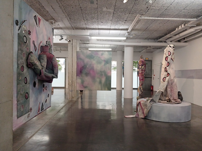Mathilde Denize, Sound of Figure, 2025. Acrylique et aquarelle sur toile, béton, métal. Dimensions variables. Photo : Erwan Fichou. © Mathilde Denize / Adagp, Paris, 2025. Courtesy de l’artiste et de la galerie Perrotin.