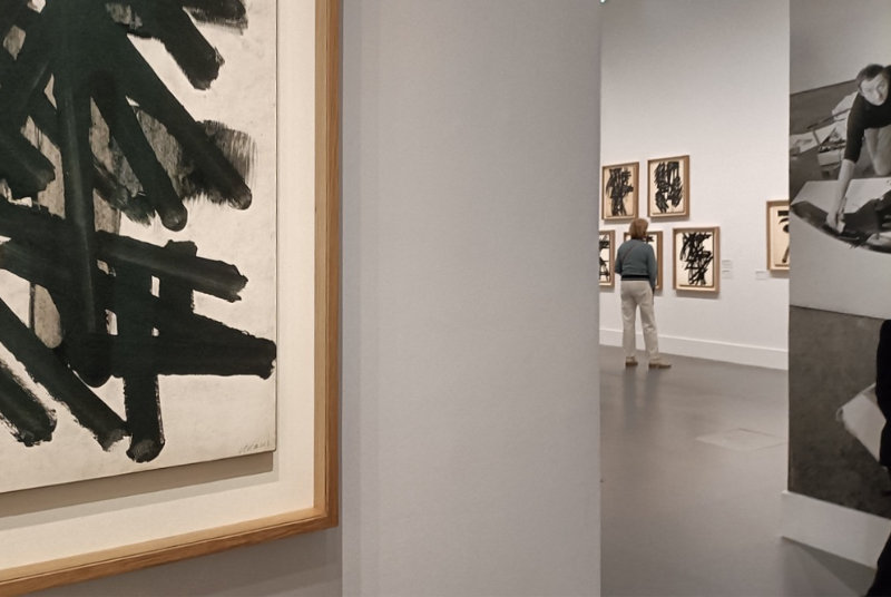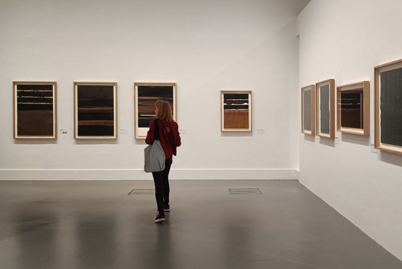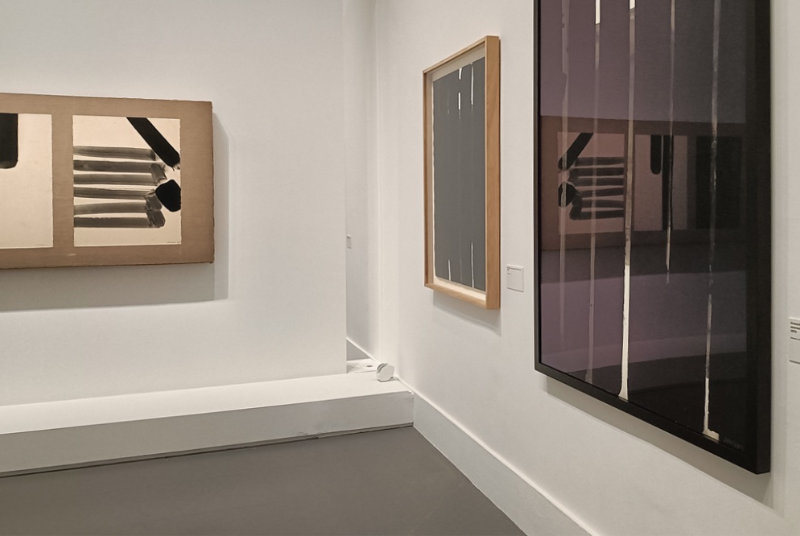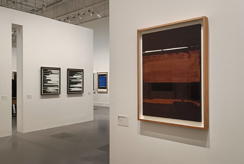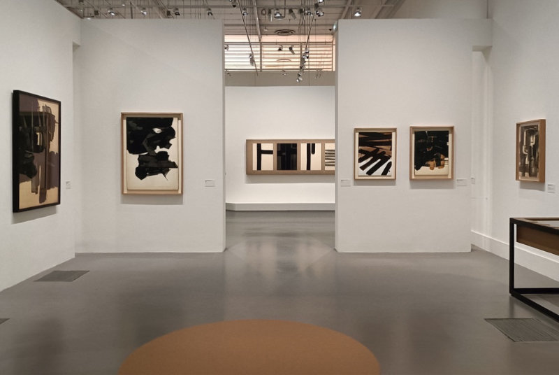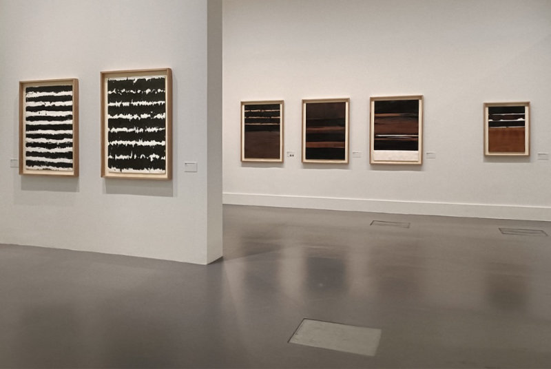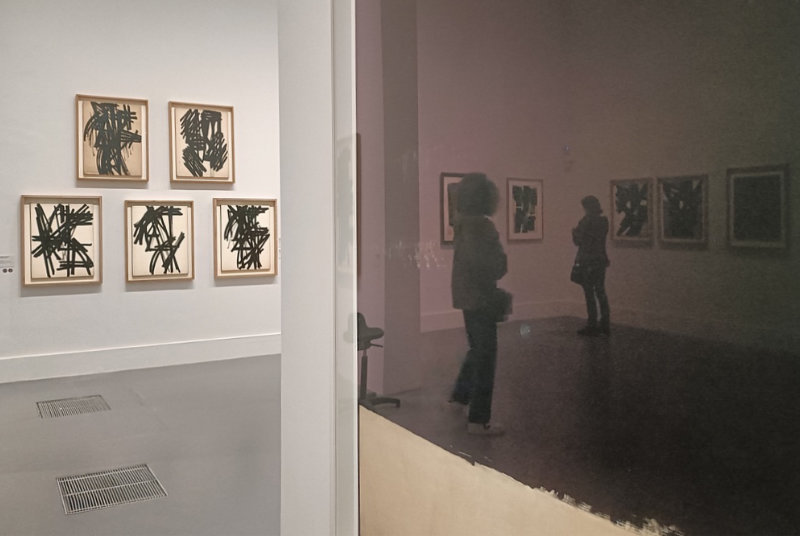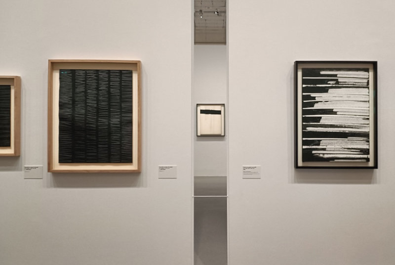 La scénographie aux murs blancs fait entrer une lumière généreuse, propice à l’épanouissement des noirs et des bruns, le parcours retrace 60 ans d’expérimentations. Du geste de calligraphe, Soulages peint une sculpture bidimentionnelle réduite à une ombre verticale. Ses gestes sont répétés comme des mantras, l’encre s’épaissit, le trait raccourcit, puis apparait la masse, le monumental, le dolmen noir qui absorbe la lumière, la transforme en une matière nouvelle, encore pleine de mystère. Des orthogonalités inspirées par Mondrian qu’il découvrit avec admiration, ironie de l’histoire, dans un article sur l’« art dégénéré » dans un magazine de propagande nazie.