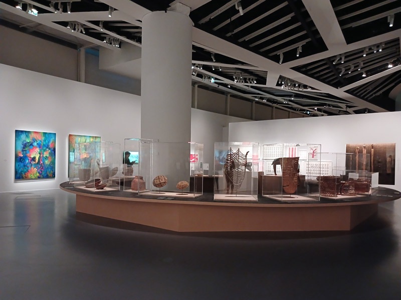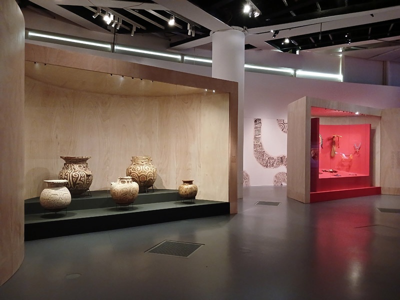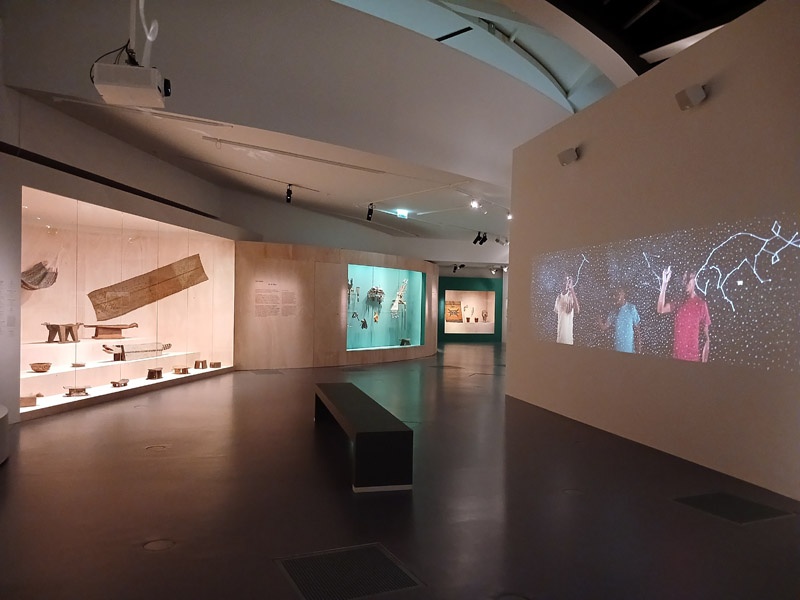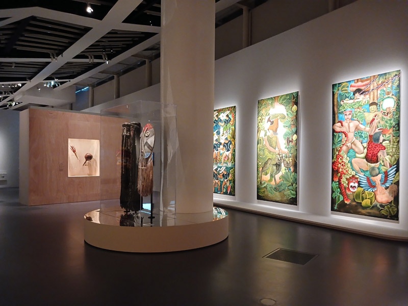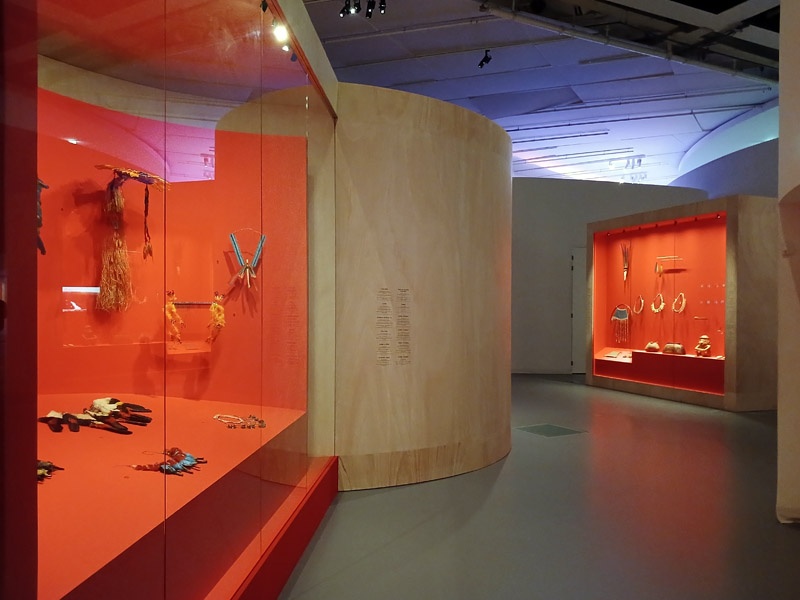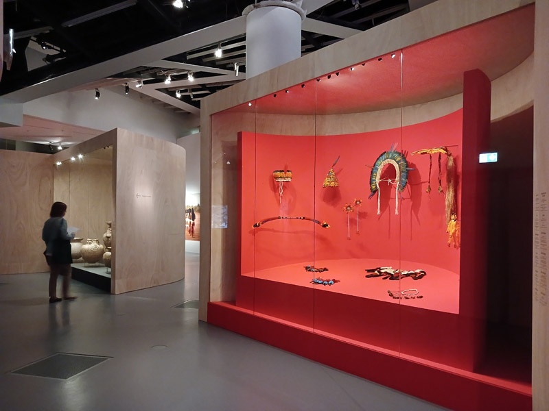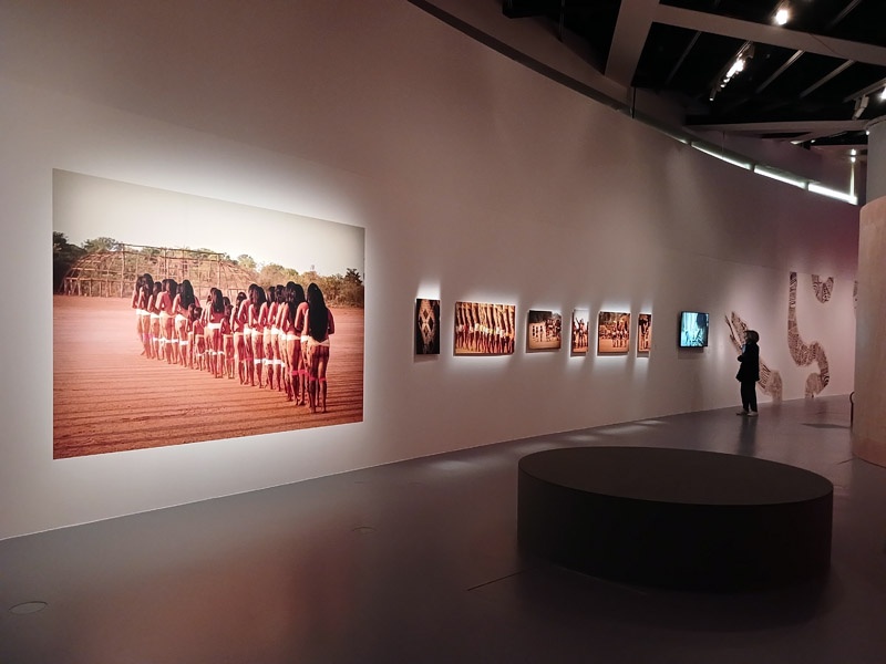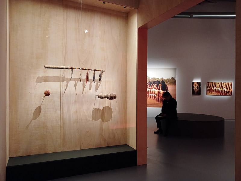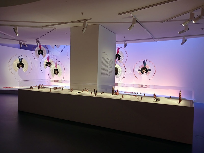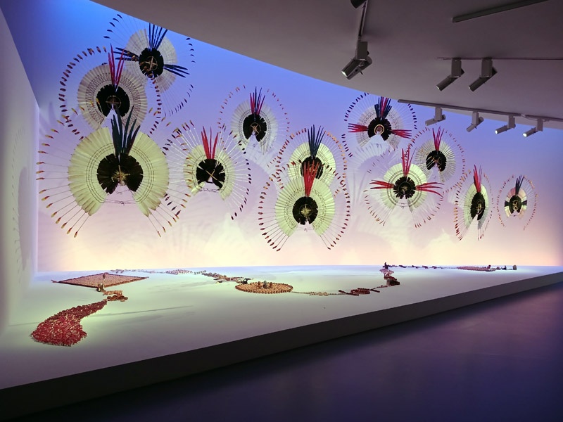 Selon les mythologies amazoniennes, le monde naît d’un processus constant de transformation, ancré dans la continuité d’un cycle, le prolongement de ce qui existait auparavant. À la différence des récits scientifiques et religieux occidentaux, il n’existe pas d’origine absolue, pas de premier monde, pas d’être primordial qui ne soit lui-même le résultat d’un renouveau, d’une réalité ou d’êtres antérieurs. La création du monde est une dynamique en perpétuel mouvement. Après l’intervention des démiurges qui ont façonné la Terre et tous les êtres, ce mouvement créateur se prolonge. Les humains ont donc la responsabilité d’entretenir la vitalité du monde. À travers les savoirs chamaniques, les rituels et les cérémonies, ils soutiennent la dynamique de transformation permanente. La première section de l’exposition présente deux mythes de création du monde : celui des Iny Karajá, qui explique l’origine aquatique de l’humanité ; et celui des peuples du Rio Negro (Tukano, Desana, Barasana, Tuyuka), selon lequel les humains furent créés à partir des ornements du peuple Tonnerre. Une place particulière est accordée aux différentes manières de concevoir la beauté de la création, tel que les Baniwa et leur relation avec des animaux sacrés, des êtres qu’il est possible d’écouter mais impossible à voir. À travers une installation immersive, le public écoute la musique du démiurge Kowai, dont le corps est constitué des sons des animaux de la forêt. Les récentes découvertes archéologiques sur les origines de l’Amazonie sont également présentées pour une meilleure compréhension de la transformation des paysages de la région en nature anthropique.