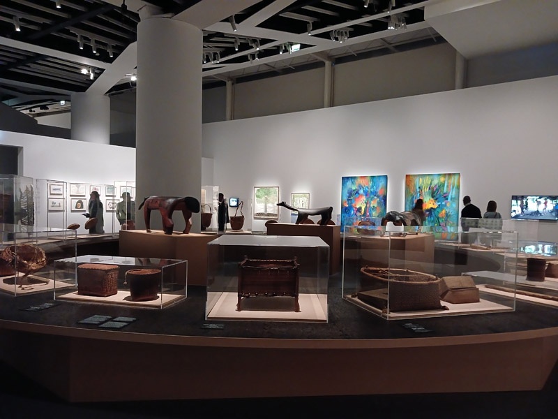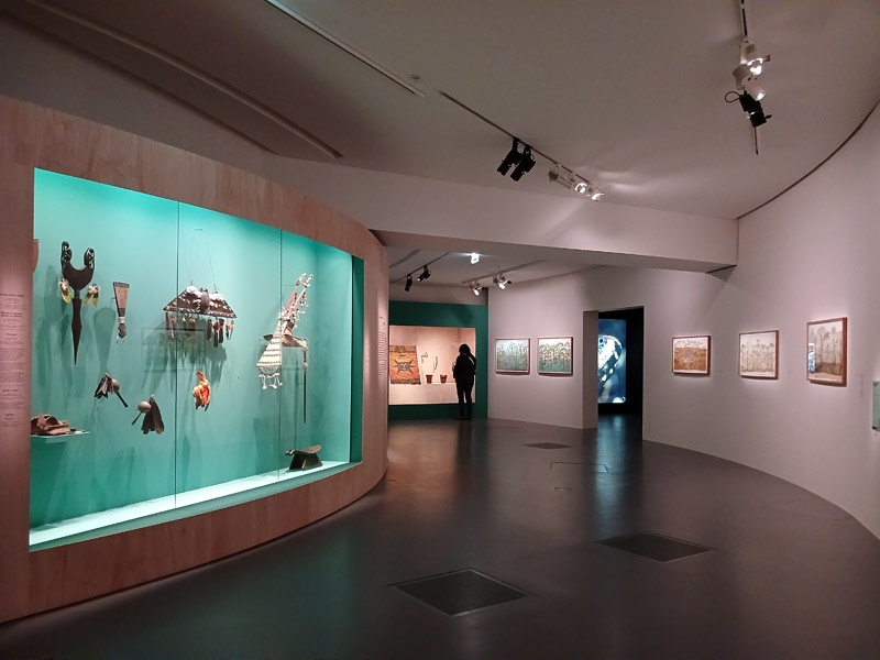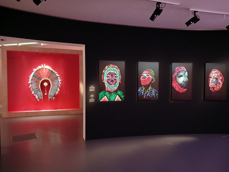 Les peuples autochtones continuent de vivre, de créer et de transmettre leurs cultures. Malgré les violences coloniales et les transformations profondes qu’ils ont traversées, ils ont su préserver et renouveler leurs manières de vivre. Leurs cultures ne sont pas figées. Elles se transforment, s’adaptent et se recomposent. Les peuples ne se contentent pas de survivre ; ils affirment la vitalité de leurs savoirs, de leurs liens avec le territoire et les autres vivants. Habitant le présent avec leurs propres repères, imaginant l’avenir à partir de leurs mondes, ils montrent que d’autres manières de vivre et de penser sont possibles. Les menaces qui pèsent sur l’Amazonie sont ici mises en avant par les oeuvres de Rember Yahuarcani qui illustrent notamment les risques liés aux épidémies et la destruction de l’environnement. Cette section présente aussi les perspectives portées par les peuples autochtones, fondées sur leurs relations étroites avec la nature. Le monde des jardins autochtones est valorisé grâce à une sélection d’objets -vanneries, outils, ornements, masques rituels- accompagnés de créations d’artistes contemporains tels que Carlos Jacanamijoy, artiste Inga, Sheroanawe Hakihiiwe et Joseca Mokahesi, artistes du peuple Yanomami ainsi que les performeuses Uýra Sodoma et Zahy Tentehar. Cette dernière section accueille un prêt exceptionnel du Brésil, une collection rare d’objets issus de peuples « isolés », qui ont choisi de vivre sans contact avec le monde extérieur.