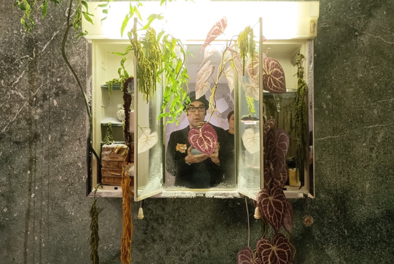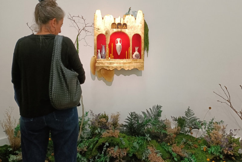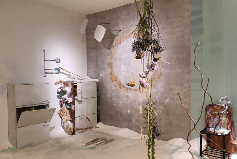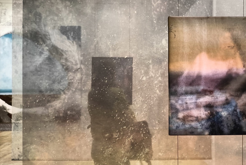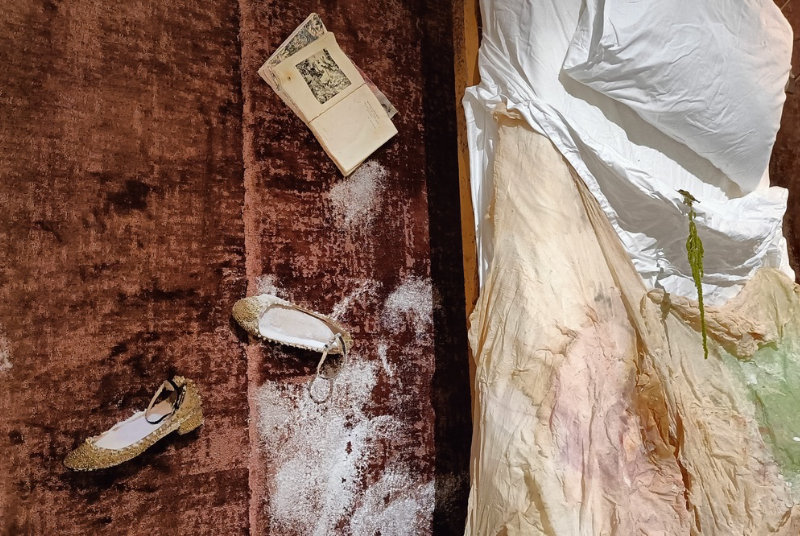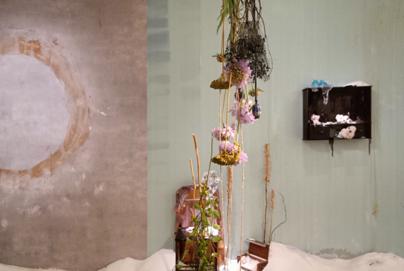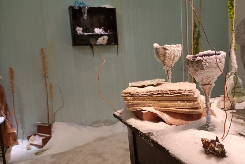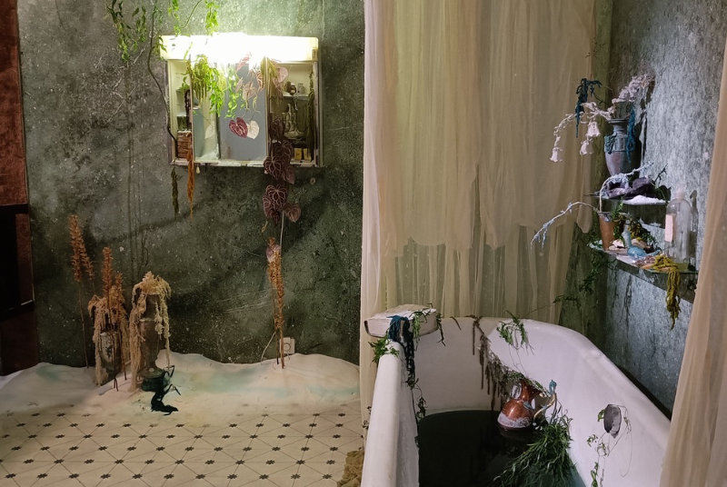 Bianca Bondi nous offre une installation baroque, rien qui n’ait jamais été vu mais plutôt une atmosphère. Nous marchons avec précaution dans une maison éparpillée en morceaux désordonnés, maison envahie par des petites dunes de sel qu’il faut prendre soin de ne pas déranger. Une baignoire est envahie de plantes, remplie d’eau verte, des épis de blés poussent ici et là. Vêtements, chaussures, verres, livres, meubles: tout semble avoir été abandonné, à présent rongé par ces cristaux de sel, cristaux chimiques, révélateurs photographiques. La photographie, justement, prend tout son sens ici tant tout est agencé pour la photo, le post Instagram. Voici l’œuvre contemporaine par excellence, au potentiel instagrammable absolu. Les couleurs, le vert d’eau dense, le bois sombre, contrastent avec la pâleur délavée des murs, la décoloration des objets vintage vieillis par le temps, parfaite imagerie de Polaroïd, rappelle les pochettes des disques gothiques que nous aimions. Une chaise est collée au mur, un pan entier de cuisine est renversée, autant d’effets graphiques propres au selfie, d’ailleurs il y a un miroir de salle de bains dans lequel on peut apercevoir son visage entre deux plantes de jungle.