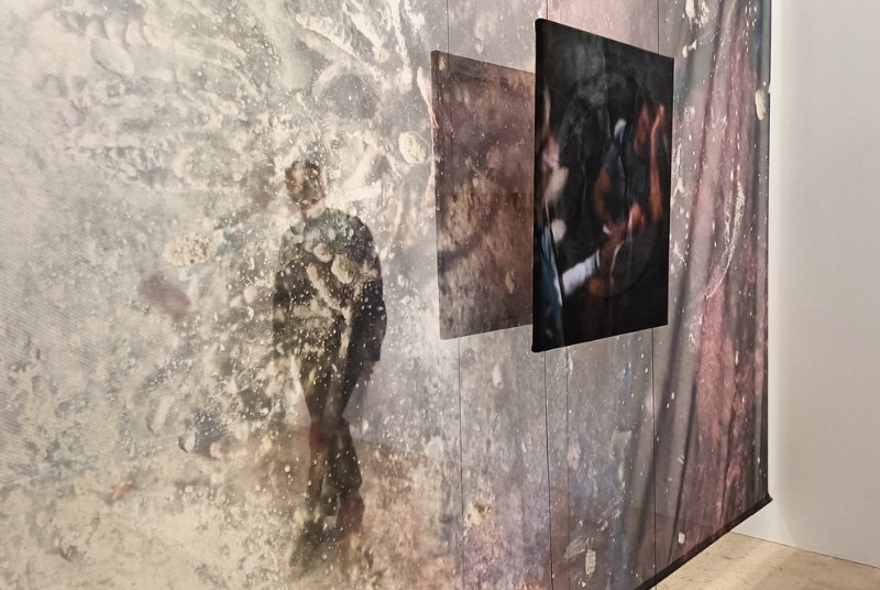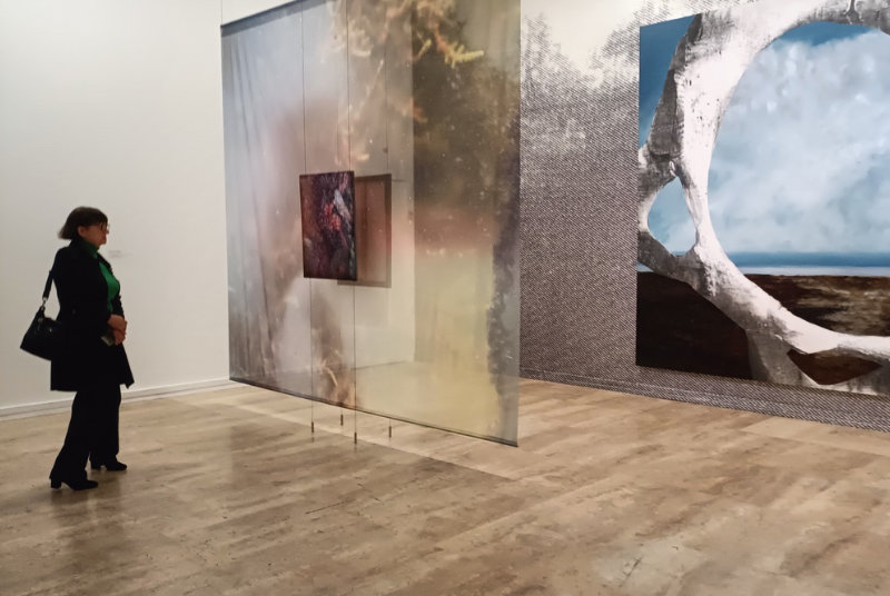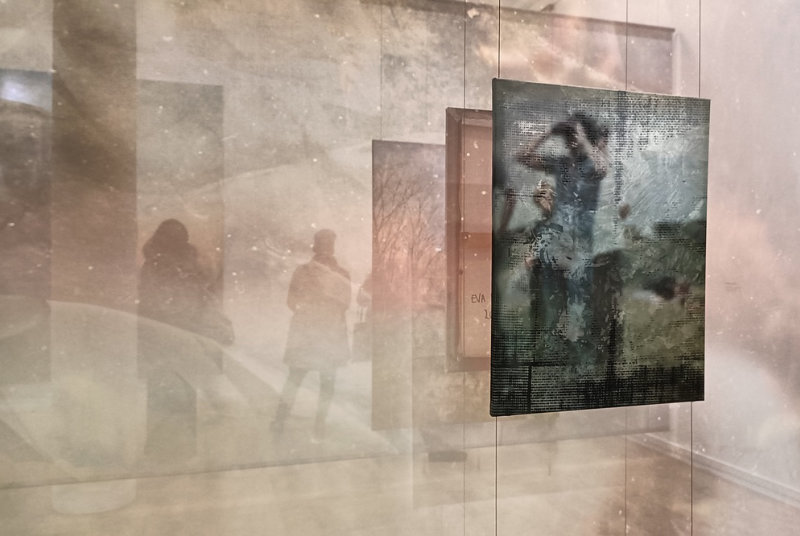 Eva Nielsen commence par la photographie. Ses images sont modifiées, transformées par des séries de filtres comme autant d’érosions, de sédimentations. Imprimées sur des toiles, mélangées à de l’acrylique, prises dans des couches de textiles, de voiles d’organza, elles deviennent des espace flous, vaporeux, à la temporalité qui s’étire sur des millénaires. Des personnages indistincts se dérobent, cela pourrait être une photo prise dans un café ou un tableau classique. Sous une architecture de sphères métalliques, utopie inquiétante, on distingue des mains, les buissons d’un tableau de paysage, une maison au fond des bois. L’installation de rideaux et de voiles successifs, couches géologiques, crée une transparence brumeuse où se laissent admirer les silhouettes fugitives, glissantes et éthérées des visiteurs. Le public entre alors dans l’œuvre, il s’y confond avec les tableaux, traversant ces couches géologiques non sans poésie.