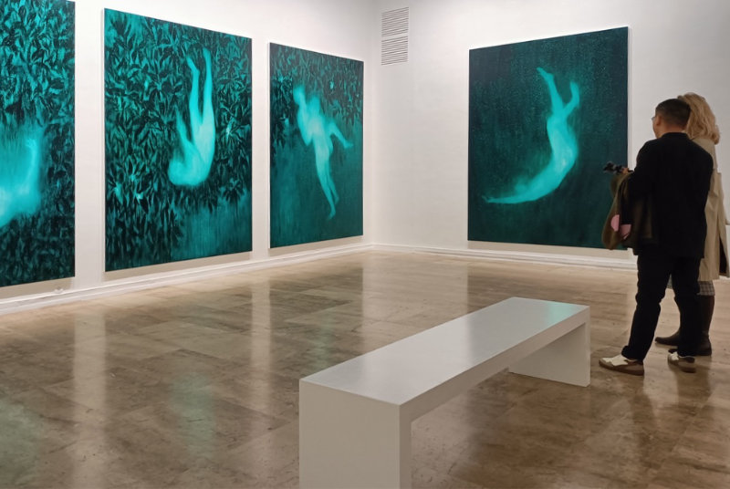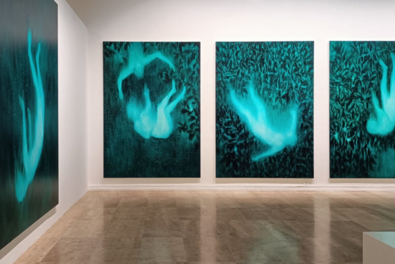 Retour à la peinture avec Xie Lei. Mais une peinture onirique, aux racines plongées dans la mythologie, les contes et l’impressionnisme. Des corps tombants, nus, ont perdus leurs traits, leurs visages s’effilochent et leurs identités s’effacent. Il ne reste que la lumière. Les hommes flottent donc, lumineux comme des lunes, en silhouettes blanches phosphorescentes. Dans un décor de canopées aux feuilles noires comme des ombres, leur chute ralentit, devient un flottement, des couples s’enlacent, des amants tentent de retenir leur partenaire qui s’éloigne, attiré par des forces invincibles. Il y a quelque chose ici de la beauté de la littérature, le mythe relu avec un romantisme amoureux d’adolescent est plutôt rafraichissant par les temps qui courent. Les trainées de bulles que laissent ces corps sombrant dans l’eau sont autant de soupirs que d’espoirs.