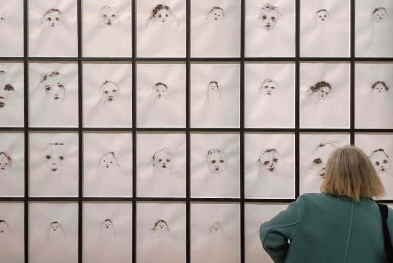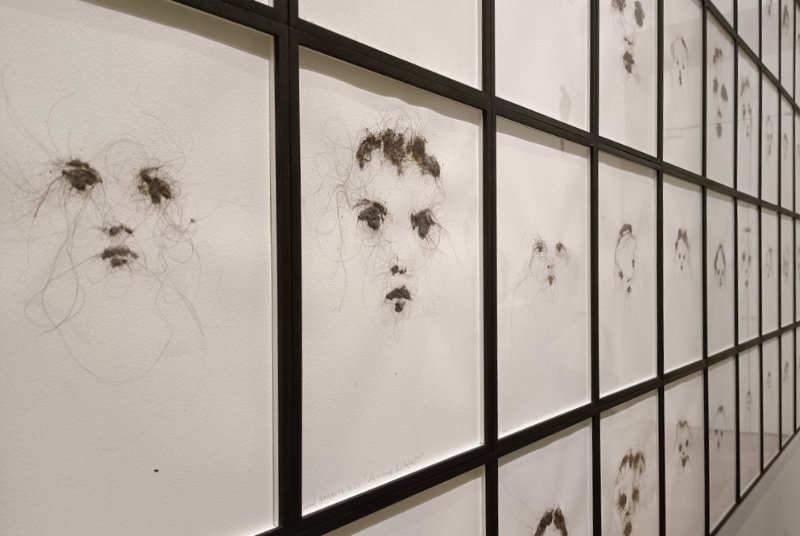Lionel Sabatté enfin, s’impose comme archéologue de la poussière, des déchets, de la matière morte. Dés l’entrée de l’exposition son dodo gris et duveteux menaçant de se défaire sous le moindre souffle fait forte impression. Des immense bêtes aux serres griffues, phénix, dieu Horus sorti de la Foire aux immortels de Enki Bilal sont perchées sur des fers à béton oxydés, animaux fantastiques modelés d’une chair de poussière mêlée de pouzzolanes grises. Son tapis carré suspendu, tissé de peaux mortes, de faux ongles est assez dégoûtant, comme la série de visages dessinés en poussière et cheveux balayés au sol du musée d’Art Moderne de Paris. Mais ces visages aux délicatesses d’enfants, leurs yeux, leurs bouches rondes chérubines nous replongent dans la peinture italienne de la Renaissance, sa grâce veloutée. C’est déstabilisant de se retrouver la sorte pris entre répulsion de la matière morte, du sale, le dégoût viscéral que provoque des cheveux tombés et l’évocation du beau, du sensible. Avec une patience d’orfèvre, Lionel Sabatté offre ainsi une experience tactile, charnelle et puissante.