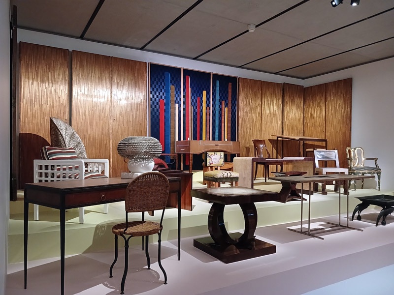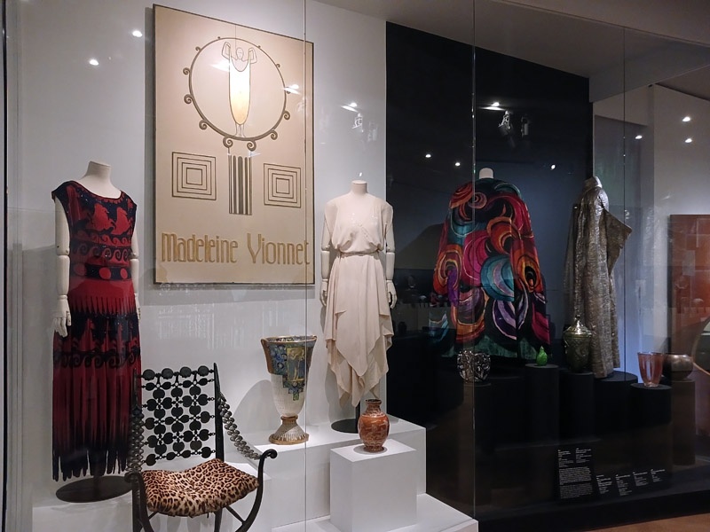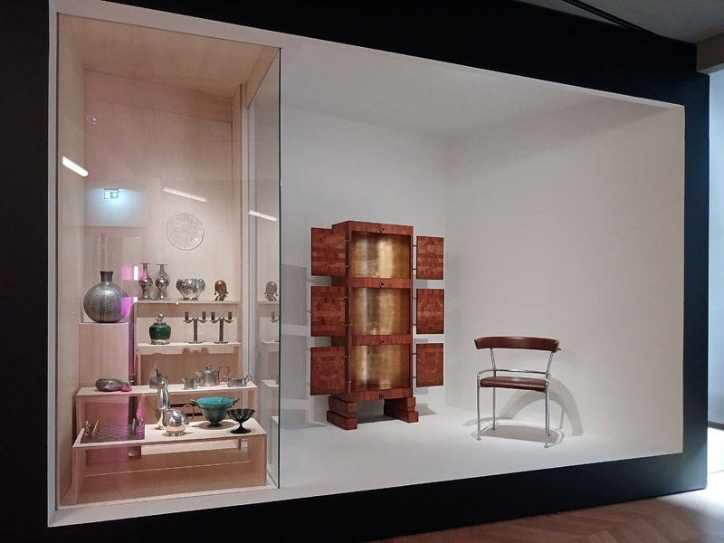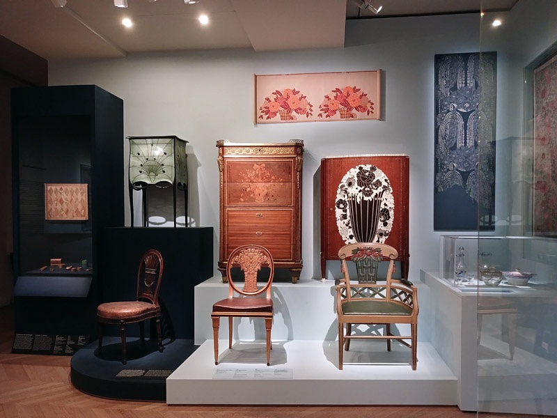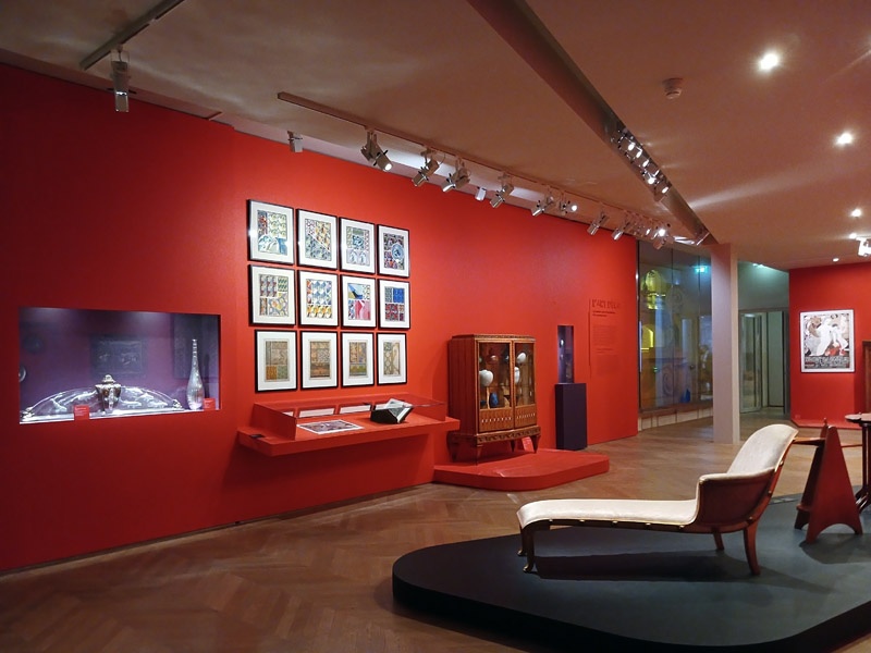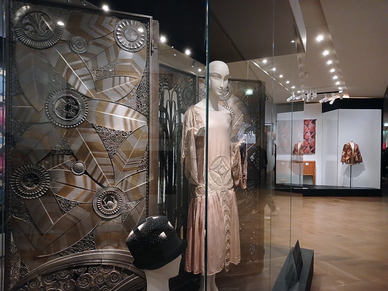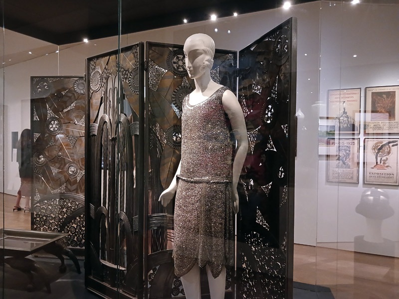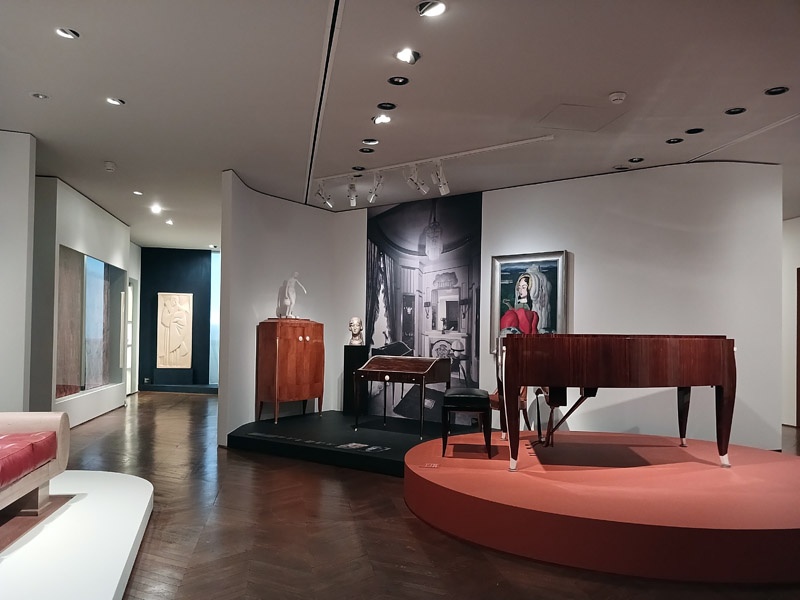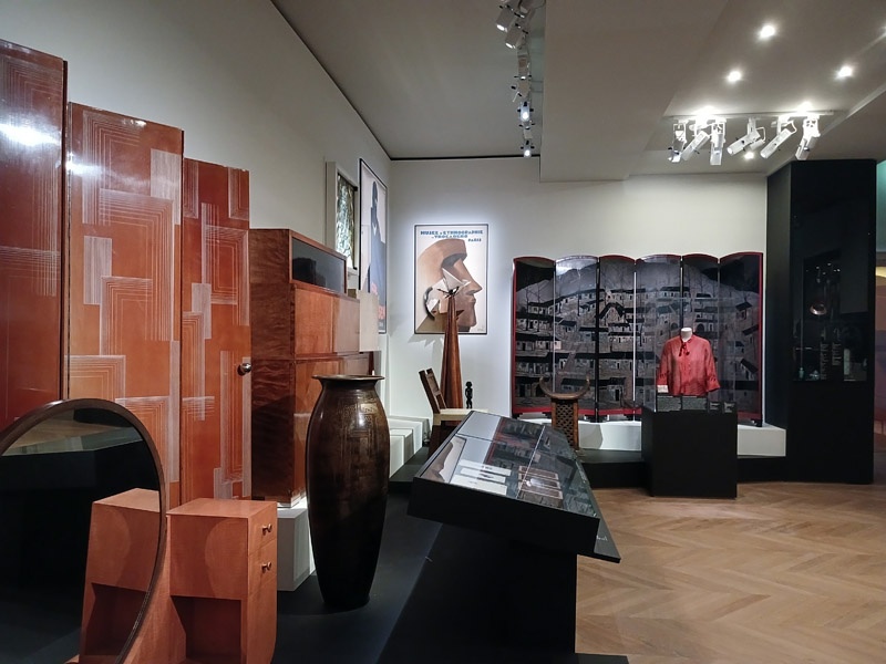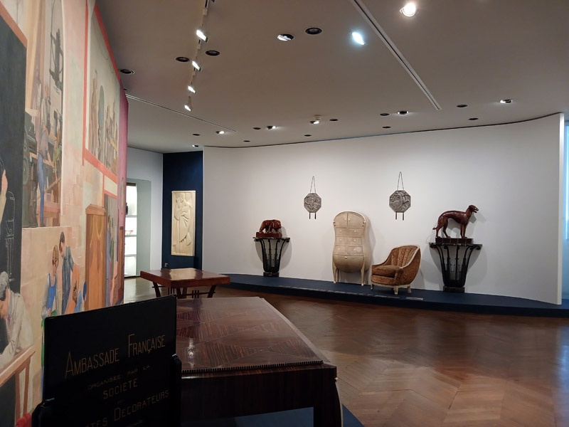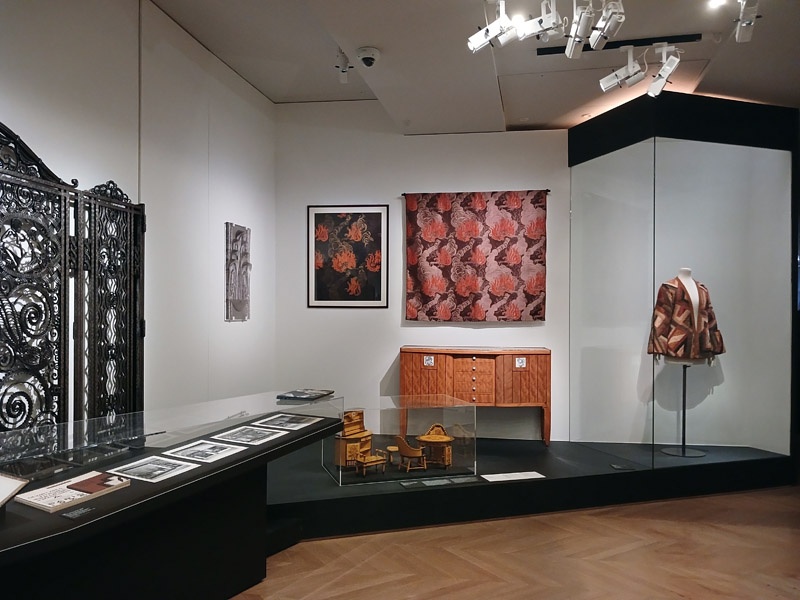 Tous les domaines de la création artistique et de la décoration sont présentés. Les remarquables laques de Jean Dunand côtoient les verreries de François Décorchemont, la tabletterie, les arts de la table, ou encore la bijouterie, illustrée par des pièces à la modernité saisissante, notamment une série de broches de Raymond Templier et de Jean Desprès. Le rôle fondamental du dessin est mis en lumière à travers des projets décoratifs, d’architecture intérieure et de mobilier, notamment les dessins de Groult pour la chambre de Madame dans le pavillon de l’Ambassade française, qui dialoguent avec le chiffonnier qui en est l’un des rares vestiges. L’univers de la mode et des arts textiles est représenté par la cape de Madeleine Pangon, la robe aux petits chevaux de Madeleine Vionnet, une veste réalisée par Sonia Delaunay, une robe de Jeanne Lanvin mais aussi des dessins de textiles et des projets de vitrines de magasins.