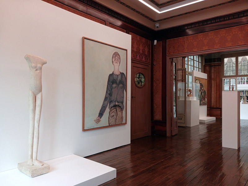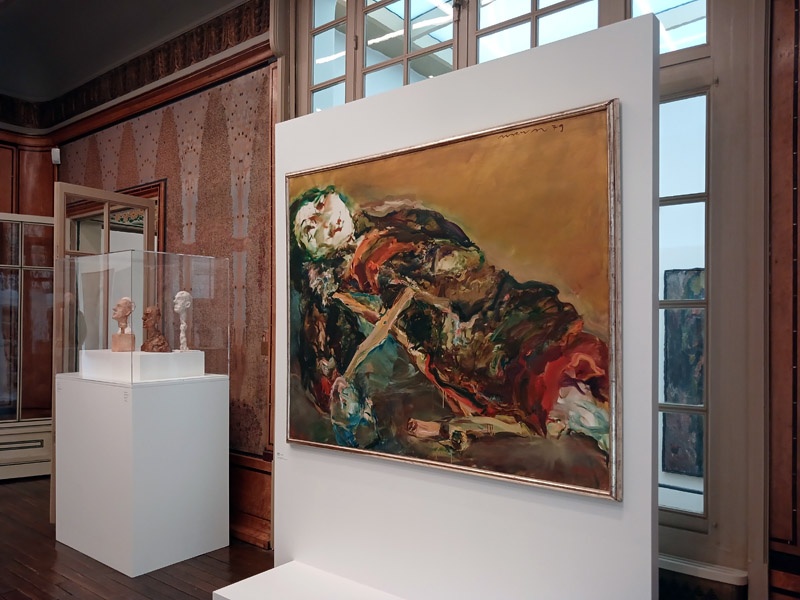 MARWAN comme Giacometti refuse l’abstraction. Ils choisissent de peindre et sculpter l’humain. Les oeuvres de la période surréaliste de Giacometti engagent une réflexion sur la fragilité de l’humain et des émotions extrêmes : angoisse, violence et pulsions sexuelles (La femme qui marche de 1932, Mère et fille, ou la Cage). Certaines d’entre elles sont évoquées dans des textes comme Hier, sable mouvant (1933), qui en décrypte le « script ». Au moment où il quitte le surréalisme, Giacometti opposera son mode créatif d’alors la réalisation de sculptures entièrement pensées préalablement, à sa nouvelle approche directe du modèle, où l’oeuvre se définit dans la réalisation. Pour MARWAN également, l’humain n’est pas simple. Il y a une grande dissonance entre la palette des couleurs et la lumière claire des fonds aux touches fondues aux personnages androgynes, dont les corps contournés, la gestuelle suggestive développent l’iconographie singulière d’êtres en demande affective. L’originalité et la violence feutrée de cette figuration, dont des sources peuvent être recherchées du côté des dessins d’Antonin Artaud comme de Edvard Munch actif à Berlin entre 1892 et 1896, n’est pas sans rappeler les Héros des premières années de Georg Baselitz ou de Eugen Schönebeck, les condisciples de MARWAN à la Hochschule für Bildende Kunst, ou les figurations de Francis Bacon, dont l’oeuvre présentée plusieurs fois en Allemagne (Dokumenta Kassel de 1959, Städtische Galerie Mannheim, 1962 et Kunstverein Hambourg 1965) est très discutée. Tous recherchent dans la figuration autre chose que le rendu de la seule apparence pour privilégier une approche existentielle. En 1964, MARWAN commence à peindre des « portraits » du poète Badr Shakir al Sayyab (1926-1964) et du responsable politique Munif al Razzaz, écarté du parti Baas par la dérive autocratique de Hafez al Hassad. Les bustes accompagnés d’attributs : une sorte de billot de bois, rappelant la guillotine et un morceau de viande renvoient à la fonction symbolique du portrait mais tire ces personnalités vers l’univers personnel de MARWAN. Giacometti a également été sollicité au sortir de la Seconde Guerre mondiale pour réaliser des monuments (Henri Rol-Tanguy, Gabriel Péri) et s’éloignant d’une simple réponse à la commande, y retrouve ses recherches du moment sur la position de la sculpture dans l’espace et le socle (dans l’exposition, Buste d’homme (1965), Buste d’homme au chandail (1953), et Buste de Diego, tête plate (1955) où la matière même devient un socle dont émerge une tête très petite. L’expressivité des toiles de MARWAN trouvent un écho, là aussi, avec le jeu sur les proportions du corps chez Giacometti.