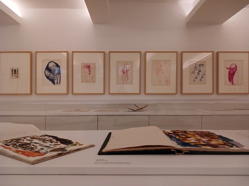 Autour de la Seconde Guerre mondiale, un nouvel outil d’écriture fait son apparition : le stylo bille. Objet modeste, économique, conçu pour l’usage quotidien, il n’est pas destiné aux artistes. Pourtant, nombreux s’en emparent et en font un outil d’exploration et de création. Le Cabinet d’art graphique présente un dialogue entre les dessins réalisés dans les années 1950/1960 par Giacometti et à partir de 1964 par MARWAN. Giacometti, artiste reconnu, griffonne sur tous types de supports : livres, revues, enveloppes… qui se couvrent de têtes, parfois jusqu’à former une véritable foule, ou de projets de sculptures dans l’espace. Ces têtes émergent de la densité des tracés superposés et traduisent souvent l’attention particulière de l’artiste à l’oeil, comme point de départ de la représentation. Si certains dessins tendent plus vers la caricature, les silhouettes prises sur le vif ou le portrait, la plupart présentent des têtes de face, établissant une relation directe entre le spectateur et une figure humaine générique. En 1963, MARWAN travaille chez un fourreur pour subvenir aux besoins de sa famille. Ses dessins au stylo bille, à l’encre et au crayon sont les transcriptions d’idées souvent reprises plus tard en tableaux la nuit et le weekend après ses heures de travail. Chez les deux artistes, carnets et dessins sur feuille donnent accès au coeur de la création. MARWAN de son installation à Berlin jusqu’à sa mort, reste en dialogue constant avec des poètes et intellectuels du monde arabe, entretenant une correspondance régulière avec Abderrahman Mounif, penseur et écrivain jordano-saoudien. A son instigation et plus encore après la mort de ce dernier en 2004, MARWAN note dans un journal ses réflexions sur l’art, sur le contexte politique, et aquarelles dessinées. Les journaux I et II sont présentés aux côtés de carnets où l’artiste rassemble certaines de ses aquarelles.