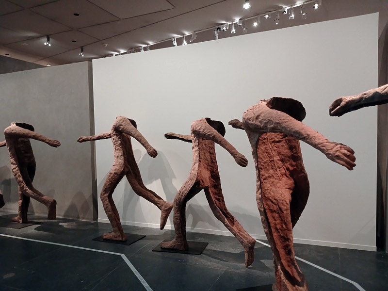 Au cours des annĂ©es 1970, Magdalena Abakanowicz se tourne vers la figuration. Ă partir du moulage sur nature dâun corps, elle appose Ă lâintĂ©rieur du moule des bandes de toile de jute, solidifiĂ©es avec de la rĂ©sine et de la colle. Elle obtient une coque dont la texture rappelle la peau ou lâĂ©corce. Lâartiste rĂ©pĂšte ce processus mais individualise chaque nouvelle figure en crĂ©ant des plis, des creux, en accentuant les coutures ou en rajoutant des cordes Ă la surface. RĂ©alisĂ© entre 1978 et 1980, lâensemble des Dos nous confronte Ă lâenvers de nous-mĂȘmes. InterrogĂ©e sur le sens de ces figures acĂ©phales, lâartiste y voit lâexpression « de la condition humaine en gĂ©nĂ©ral ». On pourrait aussi considĂ©rer quâelles participent Ă quelque cĂ©rĂ©monie, en vertu de leur disposition souvent semi-circulaire. Abakanowicz revivifie ainsi la dimension rituelle de la sculpture telle quâelle lâa expĂ©rimentĂ©e en Papouasie-Nouvelle-GuinĂ©e. La genĂšse de Figures dansantes est liĂ©e au choc esthĂ©tique du butĆ dĂ©couvert par Abakanowicz au Japon, en 1990. Dans un pays hantĂ© par le dĂ©sastre dâHiroshima, la tension extrĂȘme de cette chorĂ©graphie dâavant-garde tient du rituel conjuratoire. On en retrouve le caractĂšre Ă la fois libĂ©ratoire et angoissant dans lâĂ©lan suspendu de cette « danse sans tĂȘte, sans visage, une danse vers nulle part. [âŠ] Ils se tiennent par la main sans se voir, [âŠ] comme dans une dĂ©bandade, une dĂ©sertion ».