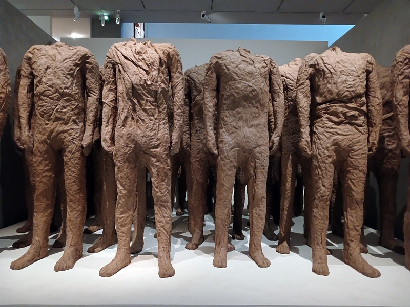 On dĂ©couvre ensuite dans les alvĂ©oles bĂ©tonnĂ©es du musĂ©e les ensembles des Mutants et de La Foule V. Quand les Mutants occupent lâespace de maniĂšre indĂ©terminĂ©e, le peuple anonyme et inquiĂ©tant de La Foule V matĂ©rialise la rĂ©flexion dâAbakanowicz sur « la foule agissant comme un organisme dĂ©cervelĂ© ».