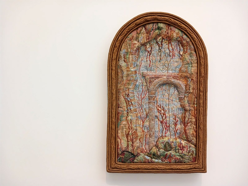 Un tableau en broderie présente un monde englouti sous les eaux, un autre une arche perdue dans les bois nous rappelant l’engouement romantique pour les ruines romaines au XVIIIème. D’autres sont des reliquaires vénérant des grottes et des chutes d’eau comme des sexes féminins. Une cascade de fils aux reflets argentés tombe comme un rideau dans son cadre de carton. Un drapé céleste aux accents cristallins.