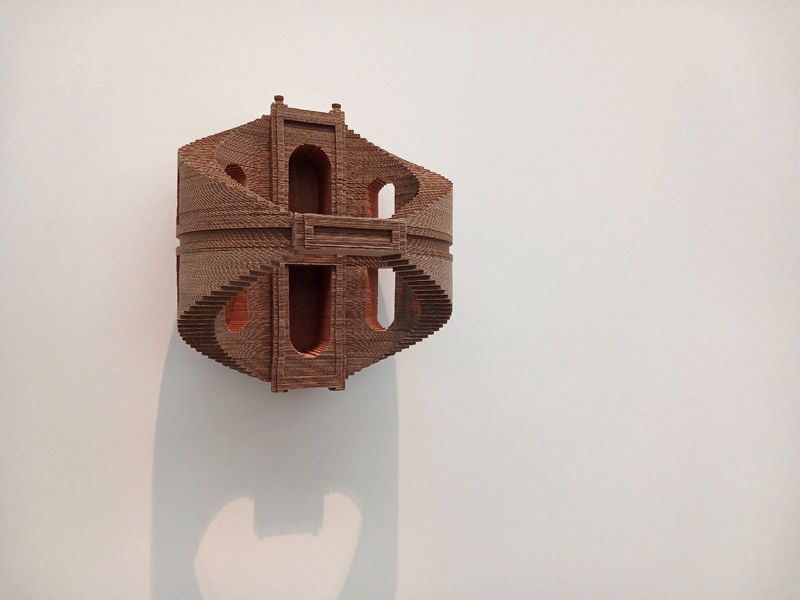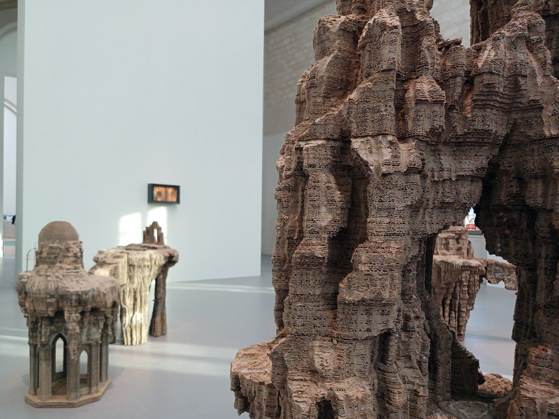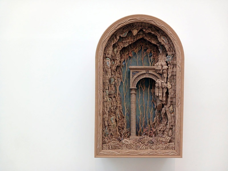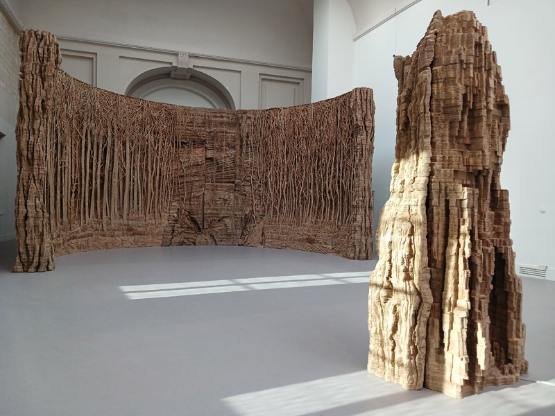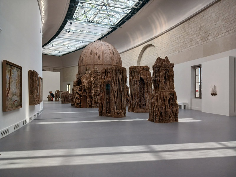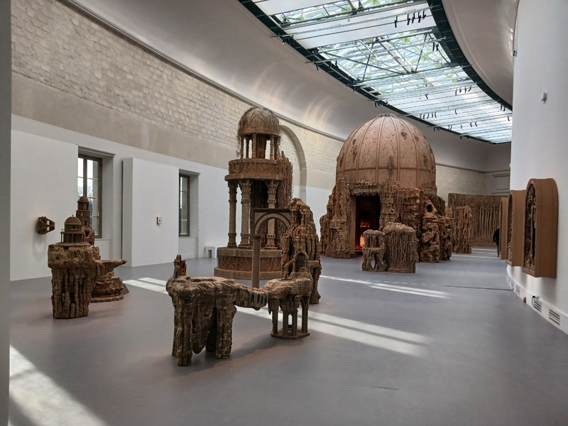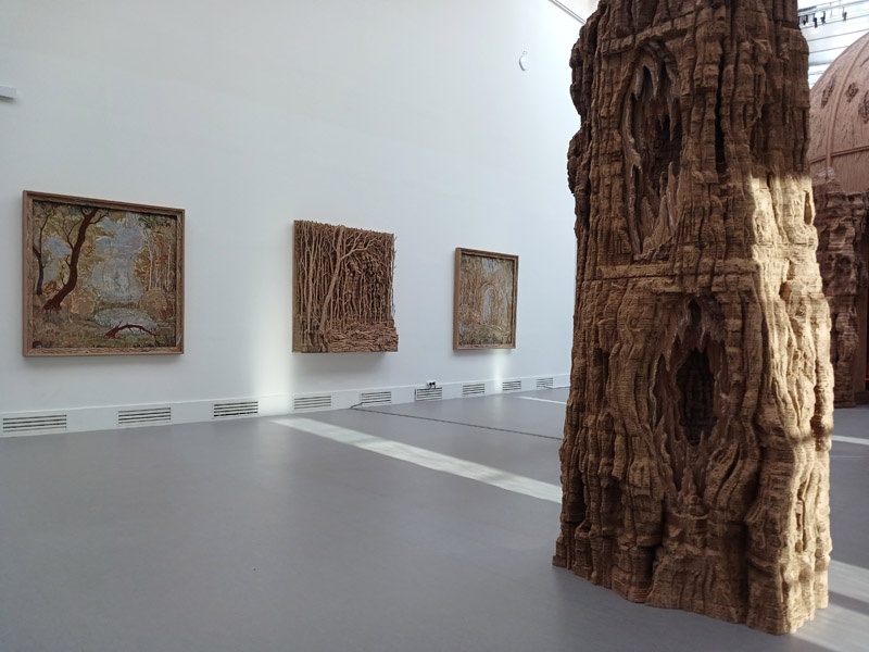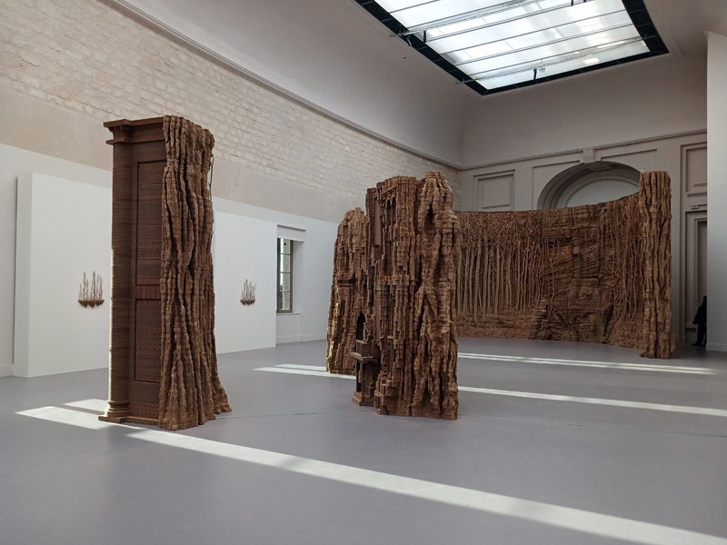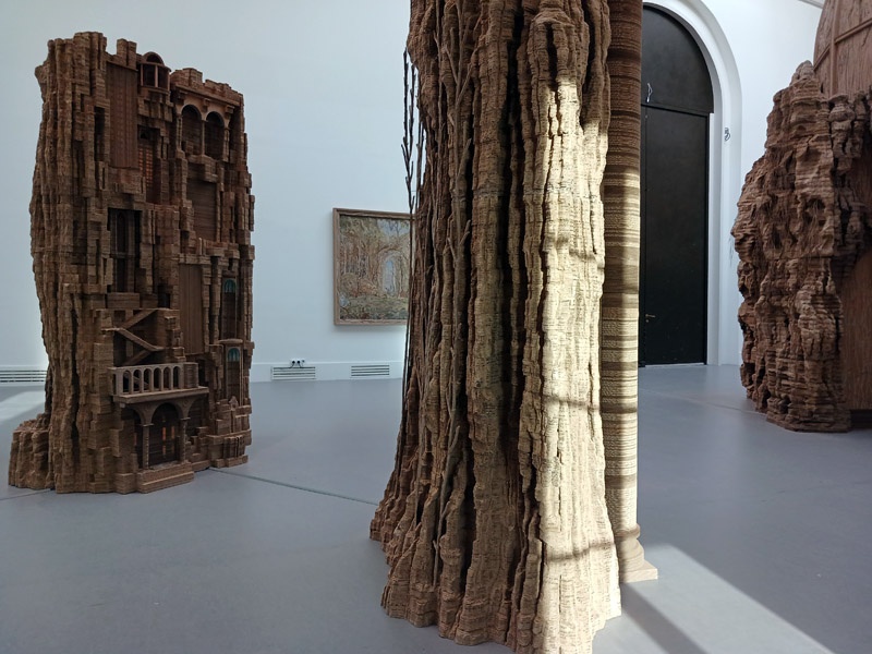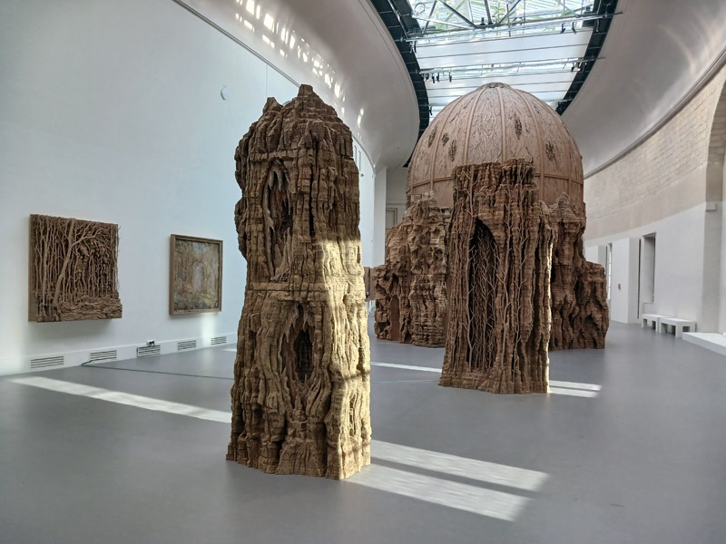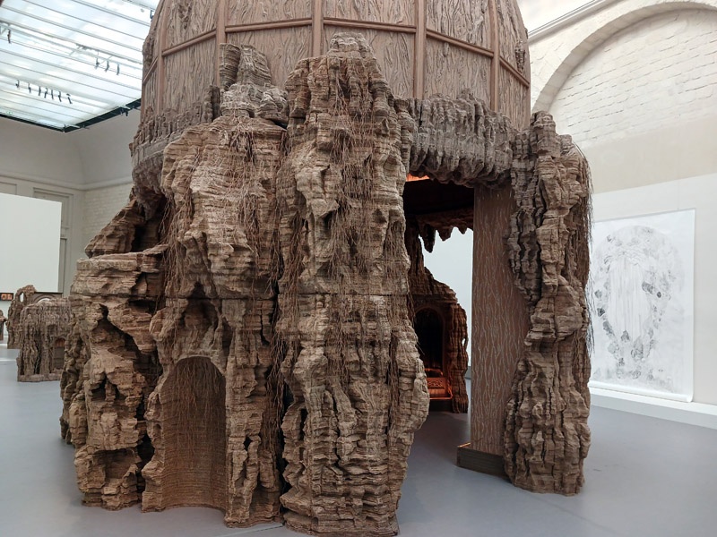 Le visiteur est invité à traverser l’exposition comme on entre dans un monde. Pas à pas. En surplombant d’abord un Promontoire, en contournant un Cénotaphe, en pénétrant une grotte ornée d’un dôme rappelant celui du Panthéon. On traverse ensuite des ruines architecturales ou des habitations troglodytes pour arriver enfin devant une immense forêt. Elle nous enlace, nous arrête, elle est impénétrable. Mais l’exposition ne se découvre jamais d’un seul regard : elle nous demande une marche constante, un rebroussement, un détour. La forêt nous contraint à revenir sur nos pas, et ainsi découvrir un autre visage, une face cachée. Car ici, le motif n’est jamais stable, il prolifère, s’ancre dans les matières comme dans les souvenirs. Le parcours où l’architecture domine à l’aller, révèle la nature sauvage et puissante qui l’enveloppe au retour.