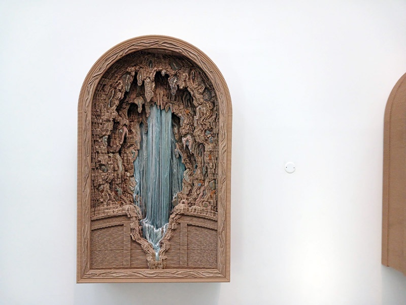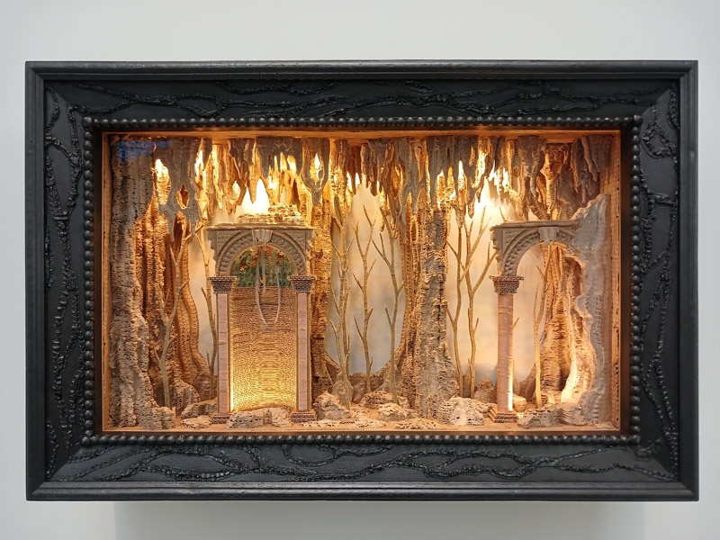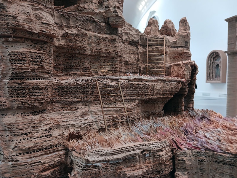 Les couches de carton ondulé façonnent des falaises de roche, assemblent les pierres des temples, les symétries des grands escaliers. Ce monde ancien évoque Angkor envahi par la jungle, Rome, Pompéi, une découverte archéologique silencieuse, mais aussi un univers de jeu video, une forme de paysage et d’architecture familières aux gamers. Ces édifices romains, temples agrémentés de bassins partagent leurs rochers avec des grottes. Des ouvertures sombres gardées par des stalactites comme des crocs ouvrent un passage vers un deuxième monde, encore plus lointain et profond, plus mystérieux encore.