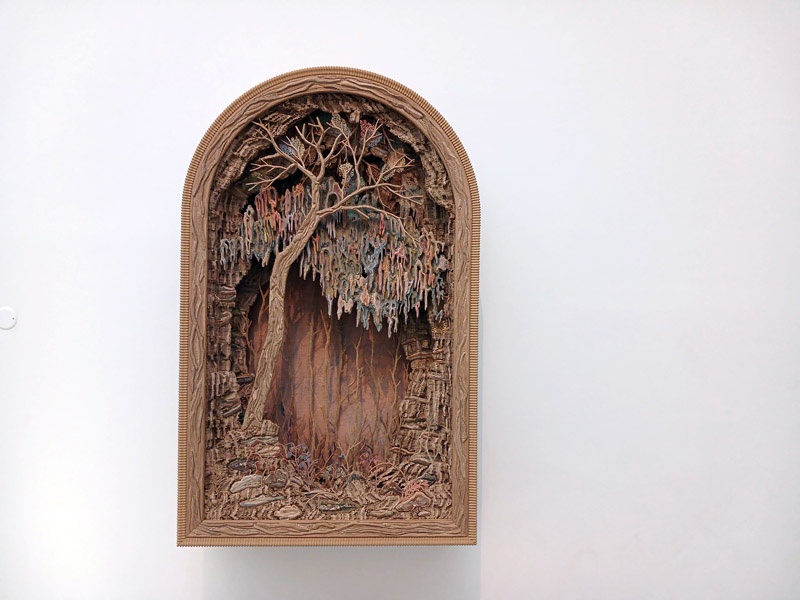 Eva Jospin introduit des petits éléments, incrustant ici et là des petits coquillages, glissant des feuilles de papier roses ou bleues entre les couches géologiques de carton brun. Une longue racine bleue rappelle les vaisseaux sanguins des planches d’anatomie, les croquis de codex exotiques.