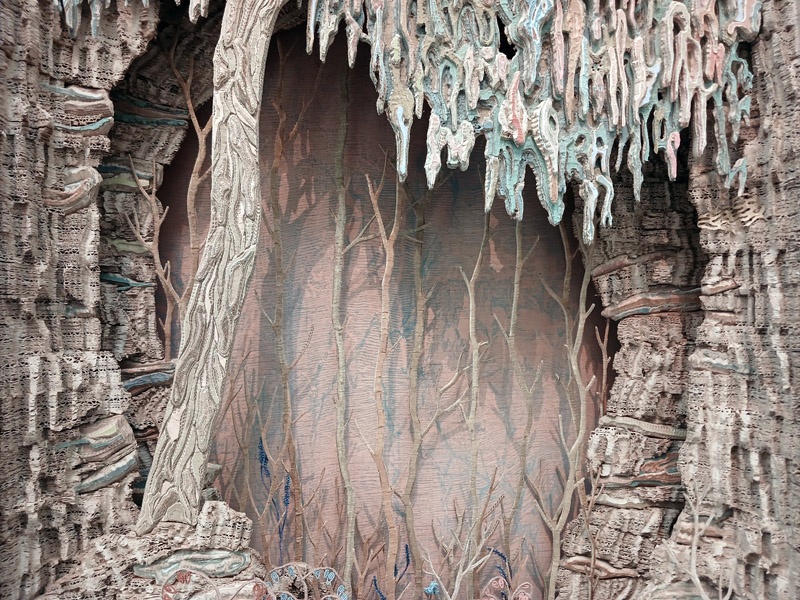 Le titre de l’exposition, Grottesco, renvoie à une légende : celle d’un jeune Romain, tombé par hasard dans une cavité oubliée où, sous terre, il découvre de magnifiques fresques. Ce n’est qu’ultérieurement que l’on reconnaîtra en ces vestiges la Domus Aurea de Néron, ensevelie depuis des siècles. À partir de ce palais qui semblait grotte naît le « grotesque » — un style où le végétal, l’architectural, le fantastique s’enlacent dans un imaginaire foisonnant. C’est à ce fil que s’accroche Eva Jospin, pour tisser son propre monde. Depuis une dizaine d’années déjà, la grotte a pris racine dans son travail, s’ajoutant à la forêt, l’habitant, la transformant. Dans ses dessins, ses sculptures et ses installations, on retrouve cette idée de cavité révélée, de profondeur cachée, de formes et de motifs en prolifération.