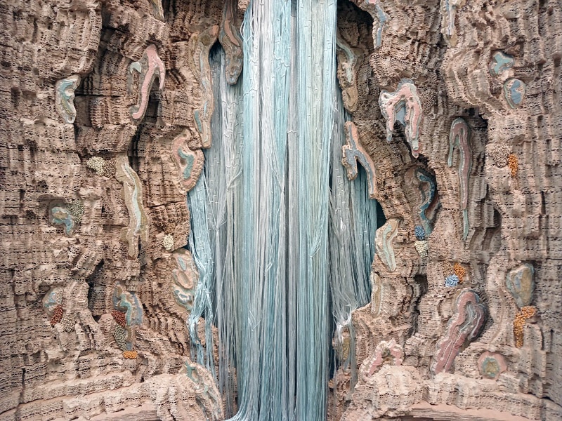À chaque détour, la perception se transforme : ce que l’on pensait reconnaître devient étrange ; ce qui semblait familier se révèle inconnu. L’architecture se mêle au végétal, le minéral dialogue avec le textile. Les oeuvres se regardent, s’imitent, se répondent, parfois à travers un simple motif répété, déplacé, réinterprété. Parmi les pièces inédites, une série de bas-reliefs brodés attire l’oeil. Fusion de textile et de sculpture, ces oeuvres bousculent la hiérarchie des techniques : la broderie perd sa planéité, gagne en volume, devient architecture. Perles, fils libres, franges et cascades évoquent des nymphées réinventés, des paysages surgit d’un autre temps. Ces broderies sculptées marquent une nouvelle étape dans le travail d’Eva Jospin, une nouvelle extension de son périmètre de marche ou d’exploration vers des formes encore plus hybrides.
