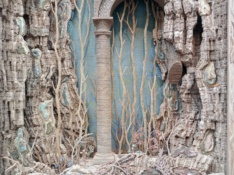 Vue d’exposition Eva Jospin, Palazzo, 2023, Palais des papes, Avignon. © Benoît Fougeirol. © Adagp, Paris, 2025. Oeuvres visibles : Eva Jospin, Nymphées, 2022. 700 x 1000 x 800 cm. Bois, carton, pierres, coquillages, papier colorés, matériaux divers. & Eva Jospin, Cénotaphe, 2020. 1000 x 380 x 380 cm. Bois, carton, coquillage, liège, laiton, matériaux divers.