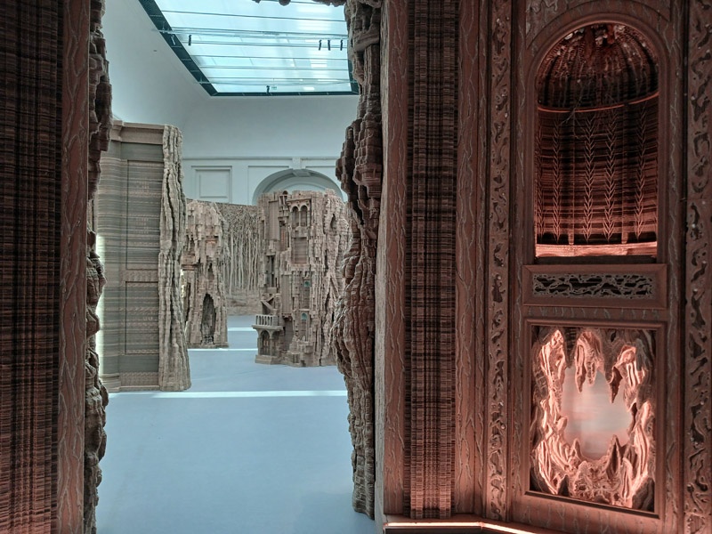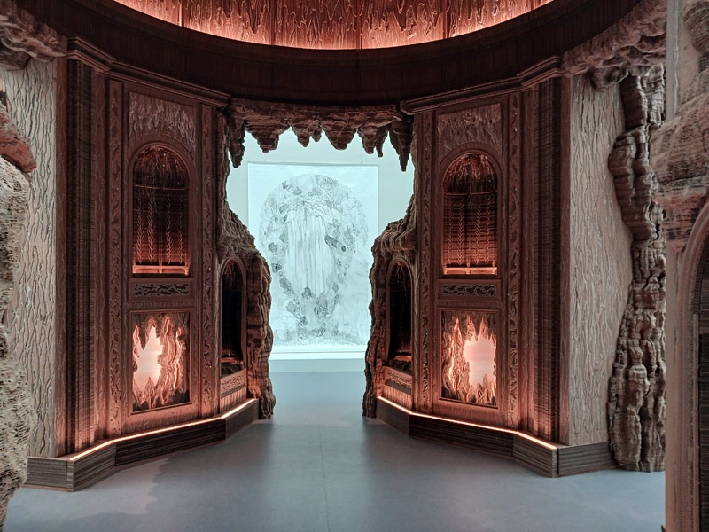 Les échelles se mélangent, on passe d’une petite maquette au gigantisme le plus flamboyant: un dôme au milieu de la salle touche presque le plafond. Sous ce dôme des petites niches ornées de stalactites sont éclairées, leur fond peint fait penser à des décors de théâtre. Le dôme lui-même semble commencer à fondre, se dissolvant doucement en concrétions qui se forment sous sa coupole, telles un glaçage de gâteau sous la chaleur, à moins que ce ne soient des racines.