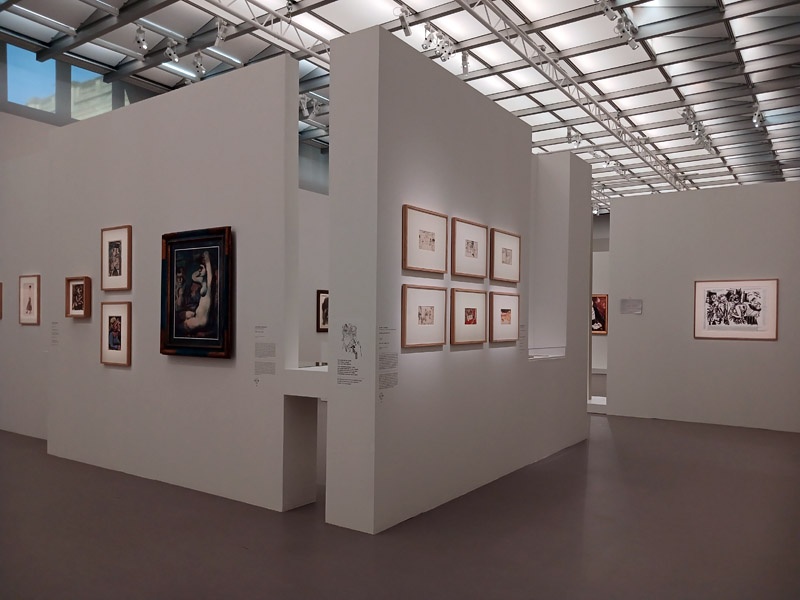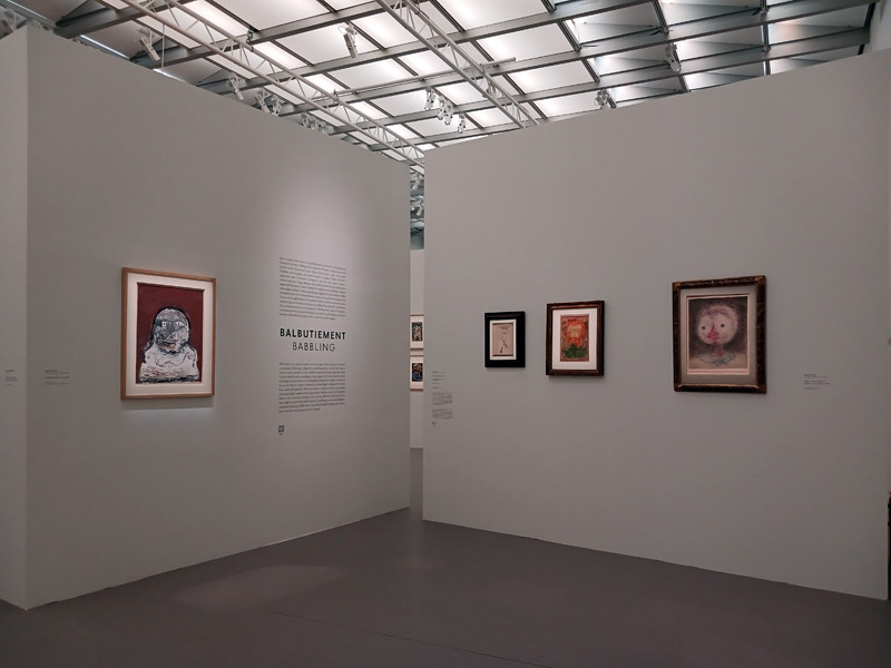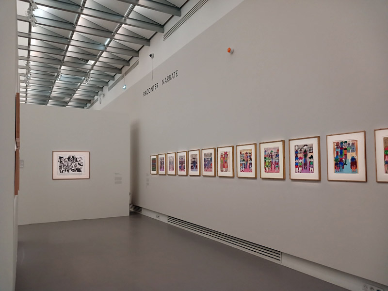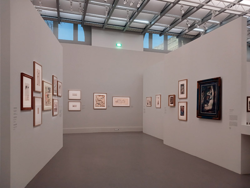 Un Fabrice Hyber, des pages de papier machine sur une grande toile pleine de chlorophylle mélange les techniques, comme la Fille au miroir de Georges Rouault, où aquarelle, encre, pastels, brossent une intimité mélancolique et orageuse. Le papier n’a rien à envier à la toile si noble. Le superbe voyage en métro de Jean Dubuffet déroule sur quelques cases une petite histoire sans paroles d’une naïveté colorée, joyeuse, musicale. Le métro est une aventure, un western, une évasion. Et puis sur le dernier dessin, lorsque les passagers descendent, apparait l’affiche “rauchen verboten” qui vient nous rappeler l’occupation.