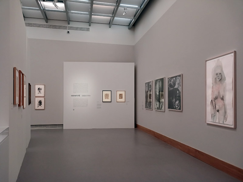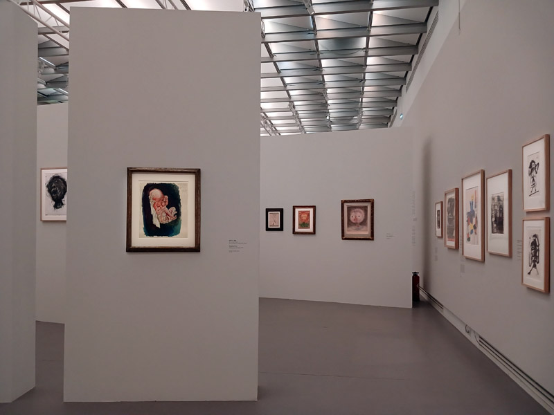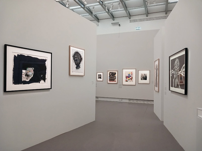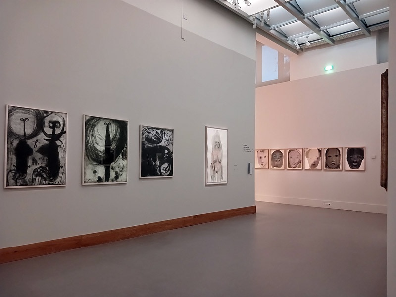 Masques et têtes dialoguent, une tête de mort d’Arnulf Rainer, un visage de Paul Klee, tandis qu’Egill Jacobsen peint une grimace d’encre noire, un rictus zébré de barreaux. Otto Dix contre Pierre Alechinsky, on a ouvert les tiroirs des réserves de Pompidou et on a fait se rencontrer tout le monde, la silhouette d’un être perdu de Marlene Dumas, une femme et son loup de Kiki Smith.
