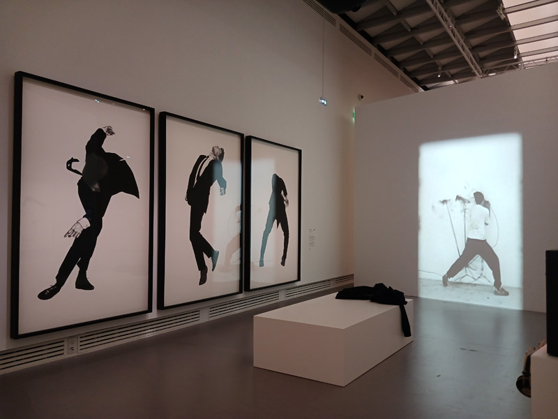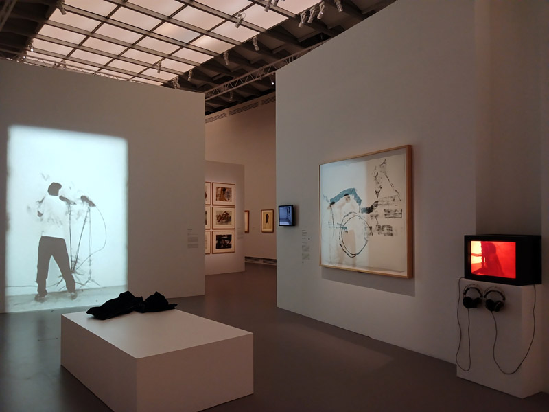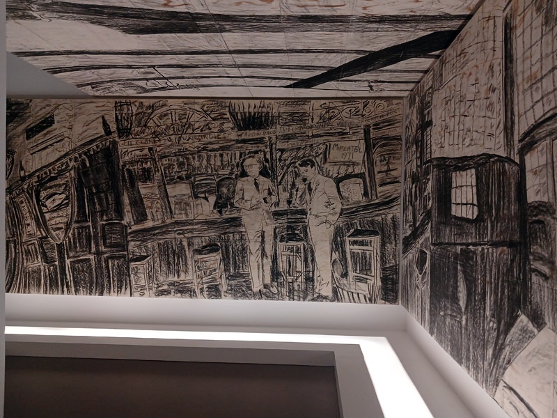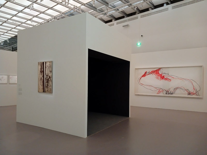 De tout petits dessins griffonnés sans façon par Giacometti, une légèreté de coin de table avant de heurter un grand dessin de Stéphane Mandelbaum, cru et sanglant comme un étal de boucher, terrifiant, plein de colère. Dans une petite pièce on peut assister à une représentation de l’immense William Kentridge. Ses grands dessins au fusain essuyés, redessinés et animés composent un fabuleux opéra, une fresque de poudre, de terre et de sang.