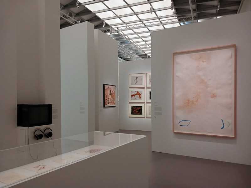 A l’étage, Gilbert et Georges recréent grandeur nature un bar londonien. Le fusain se substitue à la photographie pour plonger le visiteur entre ses quatre murs et même le plafond. Des feuilles assemblées créent une fresque entière qui se repliera à la fin pour se ranger dans une valise. Après un autoportrait d’Hockney va petit à petit venir l’abstraction, la tache, l’empreinte répétée, les rythmes de John Cage, les accidents de Tàpies. Kupka décompose sa femme cueillant des fleurs en tranches colorées, annonçant une nouvelle ère. Claude Courtecuisse trace méticuleusement le plan du porte-bouteille de Duchamp, la messe est dite, le dessin de papa est mort! On cherche chez Mario Merz la source de sa grande forme animale, pastel gras sur une grande feuille de calque, en vain, le geste, rien que le geste a dévoré le monde. La feuille se vide, le blanc de l’absence de récit et de figuration se rapproche du blanc du mur, un dernier dessin et on s’en va. L’exposition s’est dissoute sous nos yeux. Abracadabra!