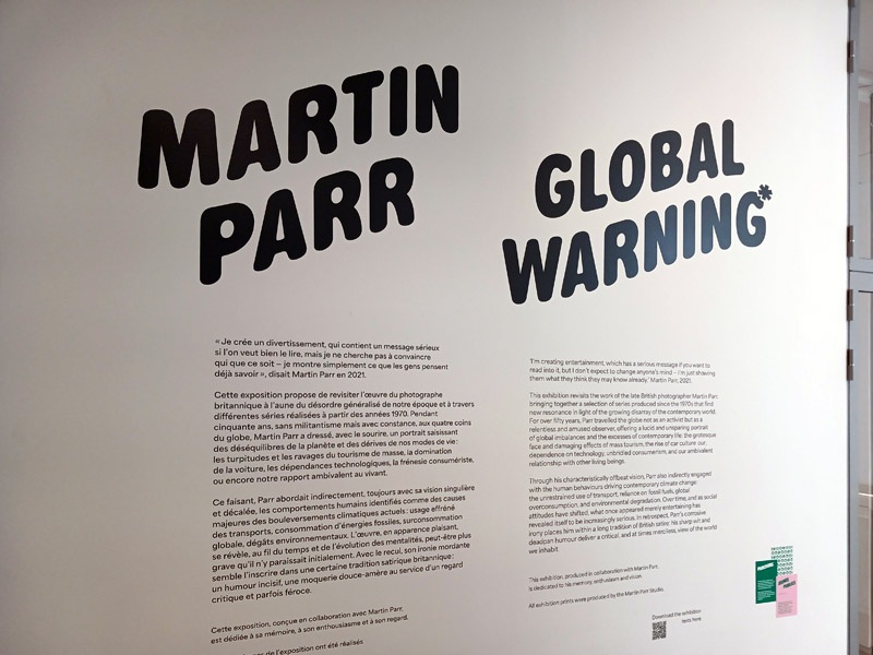 Cette exposition propose de revisiter l’oeuvre de Martin Parr à l’aune du désordre généralisé de notre époque, à travers différentes séries réalisées depuis la fin des années 1970 jusqu’à aujourd’hui. Tout au long de sa carrière, sans militantisme mais avec constance, aux quatre coins du globe, Martin Parr dresse un portrait saisissant des déséquilibres de la planète et des dérives de nos modes de vie. À travers ses nombreuses séries, commencées dans les îles britanniques et en Irlande, puis étendues dès les années 1990 aux cinq continents, émergent des thèmes récurrents : les turpitudes et les ravages du tourisme de masse, la domination de la voiture, les dépendances technologiques, la frénésie consumériste, ou encore notre rapport ambivalent au Vivant. Toujours avec son regard singulier et décalé Parr aborde indirectement plusieurs causes majeures identifiées des bouleversements climatiques de l’Anthropocène : usage effréné des transports, consommation d’énergies fossiles, surconsommation globale, dégâts environnementaux. Cet oeuvre, en apparence plaisant, se révèle, avec le temps et l’évolution des mentalités, peut-être plus grave qu’il n’y paraissait initialement. À la lumière de l’ensemble de son oeuvre, l’usage du décalage et de la dérision place Martin Parr dans une lignée satirique britannique, attentive à révéler les paradoxes de notre société.