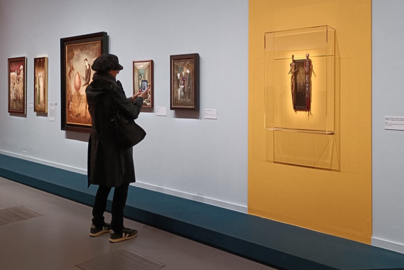 Voici une expo qui se feuillette comme un album. Les œuvres de Leonora Carrington alternent avec ses photos de famille, des amis, des photos souvenir. Leonora enfant joue à la dînette et puis grandit, elle plonge dans un monde fantastique adolescent. La littérature, la poésie sont la base de tout un imaginaire et sont indissociables du dessin. Une série d’aquarelles, les Sœurs de la Lune raconte des histoires de magiciennes, de princesses et de leurs animaux familiers, chiens et chevaux. Un bestiaire fantastique peuplé de léopards, paons, pixies voletant autour des héroïnes en robes fabuleuses. Leonora puise autant dans Shakespeare que dans les contes, le folklore européen ancré dans nos lacs et nos forêts. Elle se rêve voyageuse, sorcière, musicienne, passe d’intérieurs à des grottes glacées, explore un Orient à l’eau de rose. Ce monde d’aventures et de liberté à la naïveté encore enfantine, rafraichissante sur les murs d’un musée, rappelle celui plus terrible d’Henri Darger.