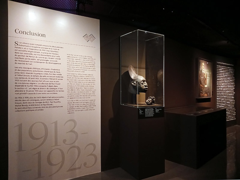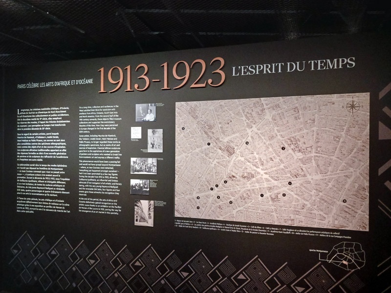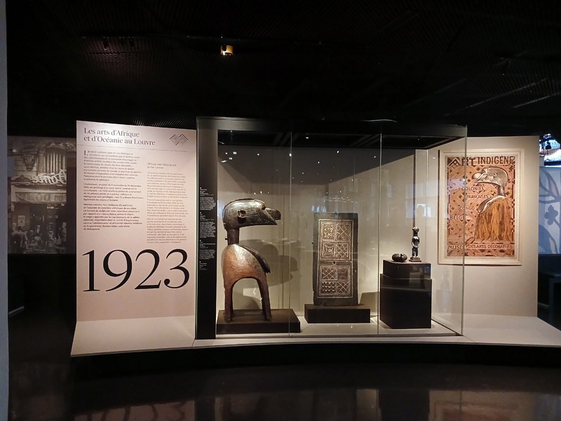 Au dĂ©but des annĂ©es 1920, les ouvrages sur les arts africains et ocĂ©aniens se multiplient et amĂšnent de plus en plus de collectionneurs Ă sây intĂ©resser. Cet engouement progressif participe Ă la dĂ©cision du conservateur du musĂ©e des arts dĂ©coratifs du Louvre de prĂ©senter au Pavillon de Marsan un ensemble dâoeuvres et dâobjets sous le titre « Art indigĂšne des Colonies françaises et du Congo Belge ». 1450 piĂšces y sont prĂ©sentĂ©es de novembre Ă dĂ©cembre 1923 Ă un public si nombreux que lâon dĂ©cide de prolonger lâexposition jusquâau 27 janvier 1924. Lâexposition 1913 â 1923 : lâesprit du temps en prĂ©sente un petit Ă©chantillon en cherchant Ă montrer le double regard portĂ© sur les objets Ă cette Ă©poque : un regard esthĂ©tique dâune part (galeristes, amateurs), un regard ethnographique dâautre part (administrateurs coloniaux, explorateurs).